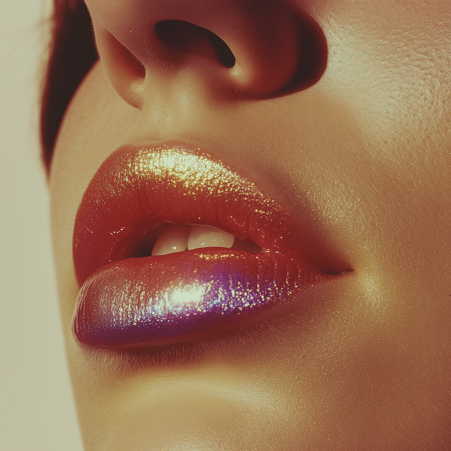 Close-up of glossy lips with metallic gold and purple gradient lipstick, glowing skin, and artistic lighting for a bold makeup look.