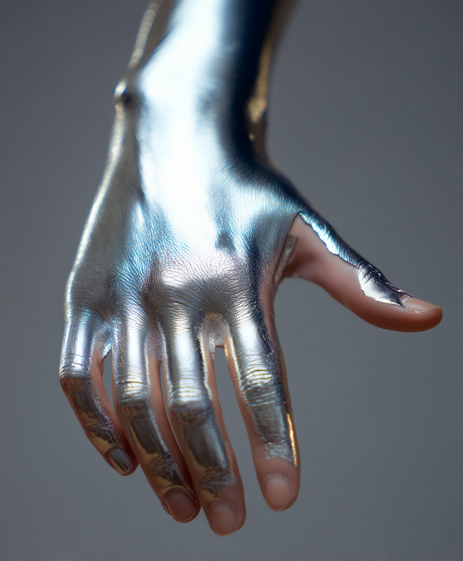 A close-up of a hand with a shiny silver metallic coating, blending art and futurism with natural skin details.