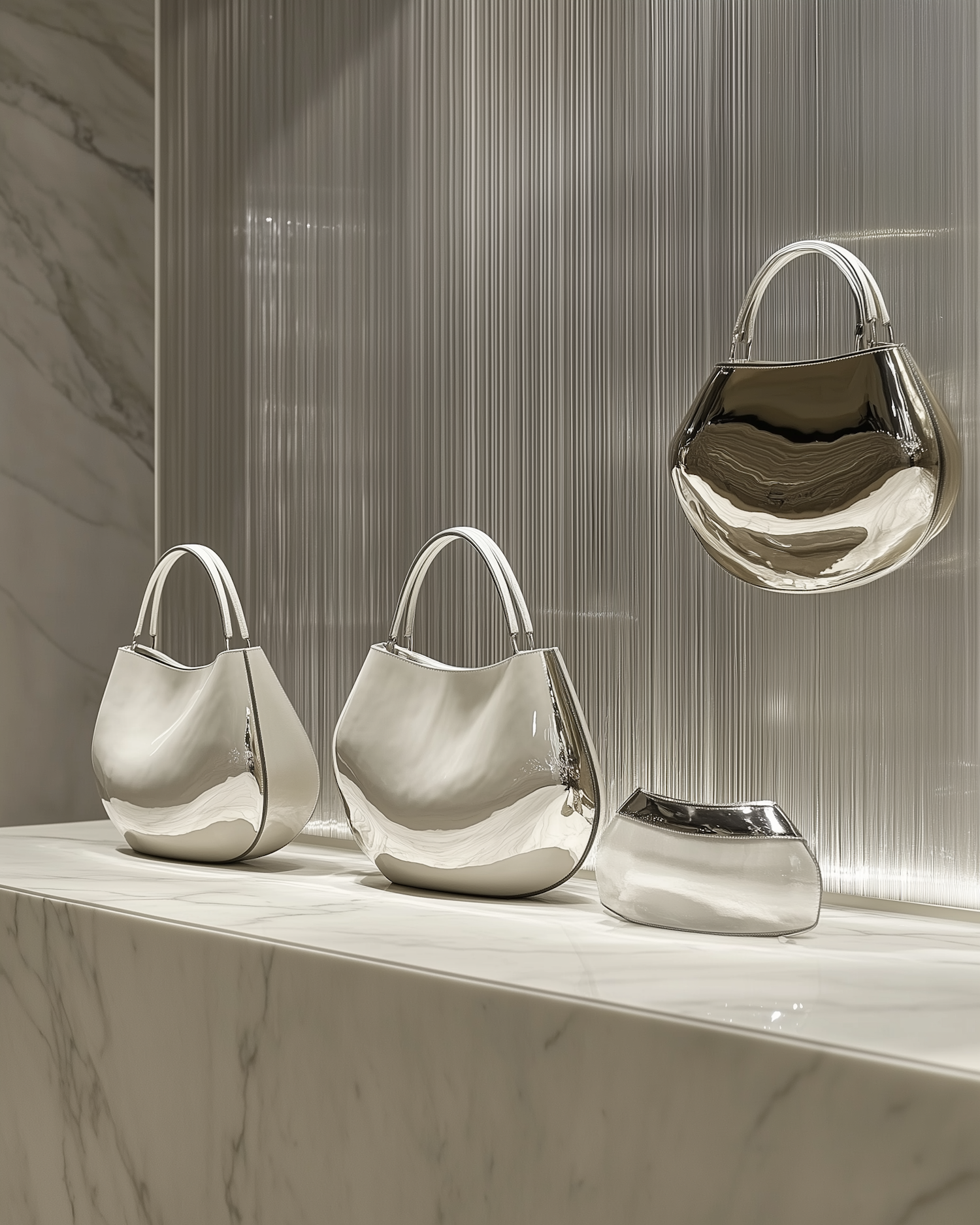 Sleek silver handbags and a clutch displayed on marble with a metallic backdrop, exuding modern luxury and elegance.