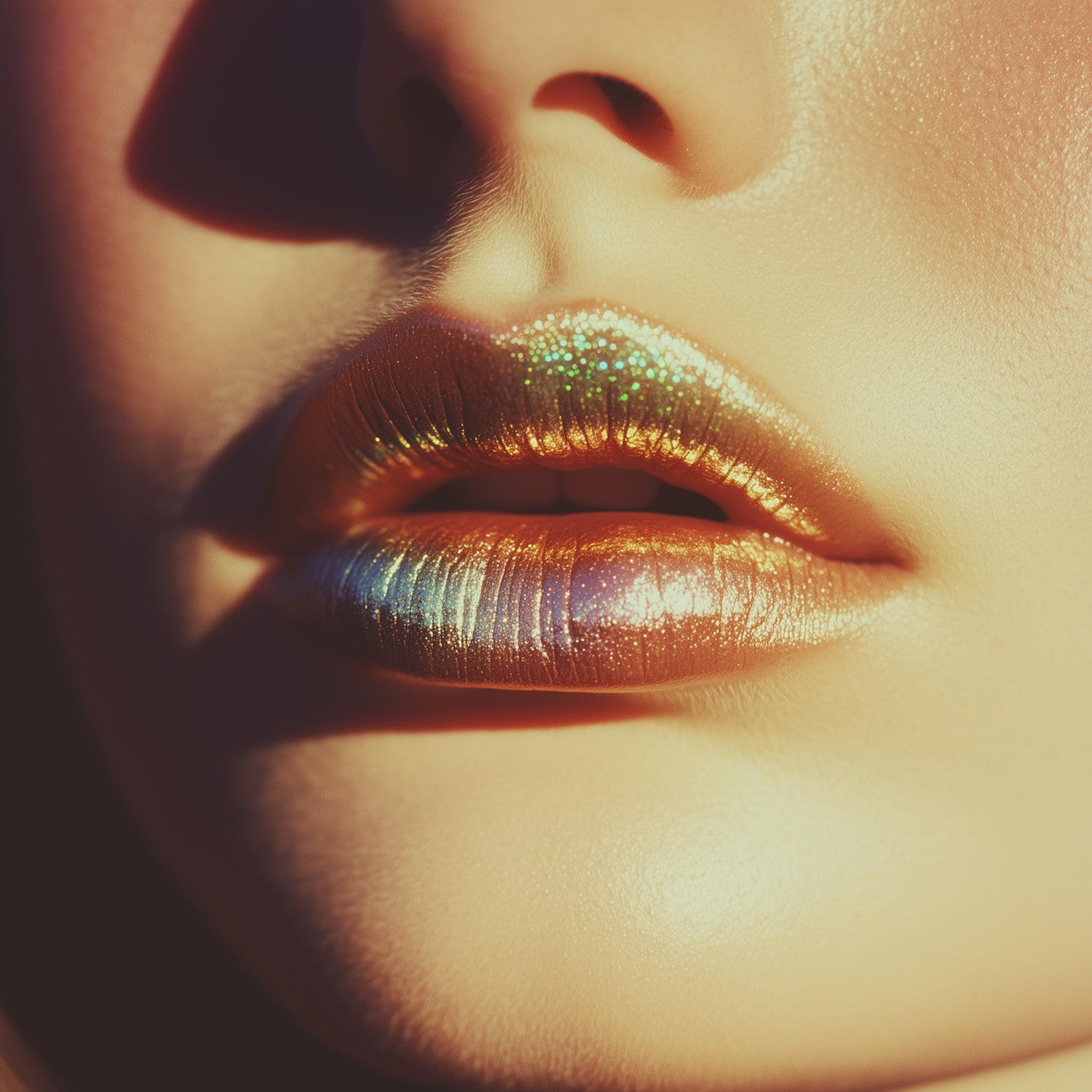 Close-up of shimmering metallic lips with gold, green, and blue hues, perfect for bold makeup inspiration.