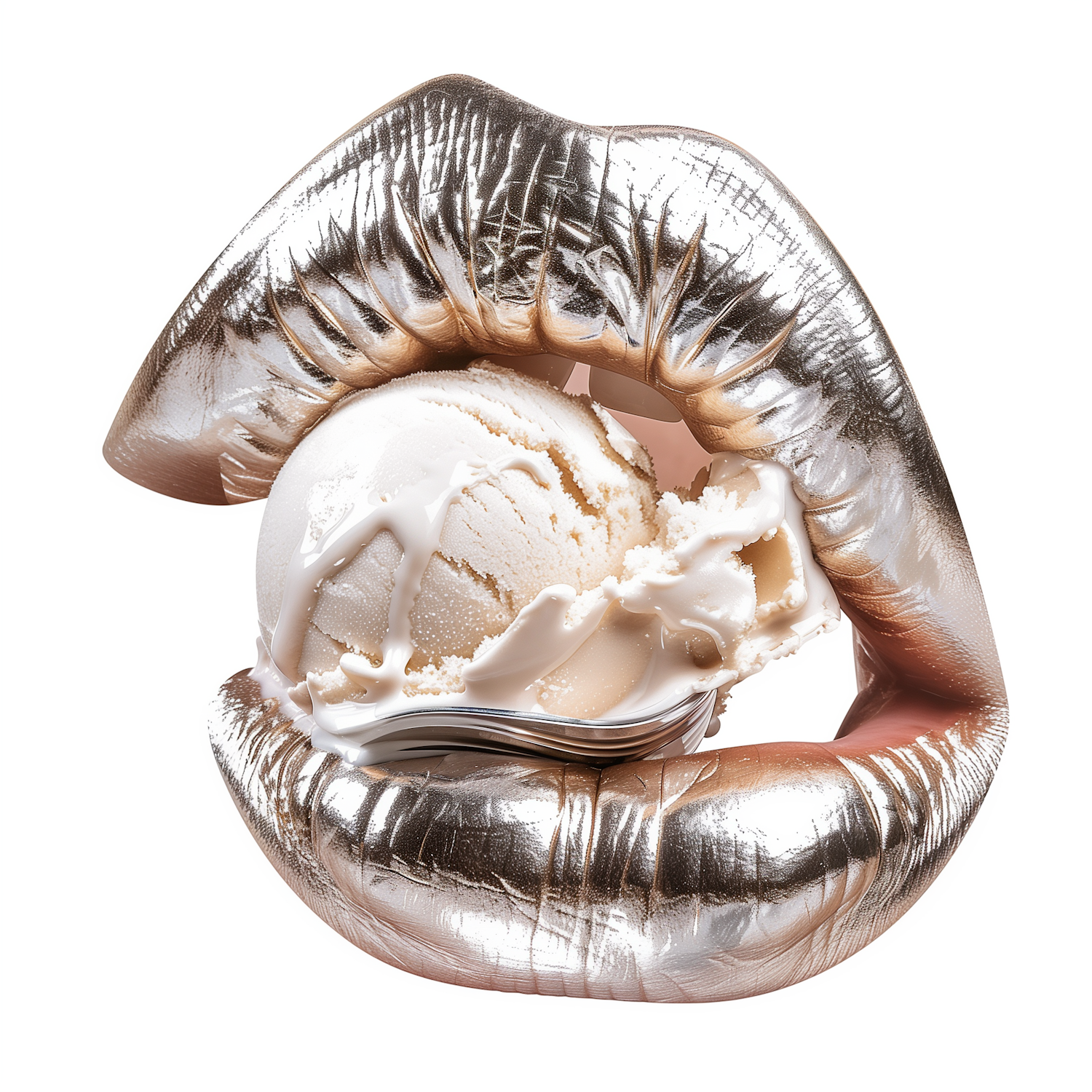 Metallic silver lips holding a melting scoop of vanilla ice cream, blending surreal art with food photography on a white background.