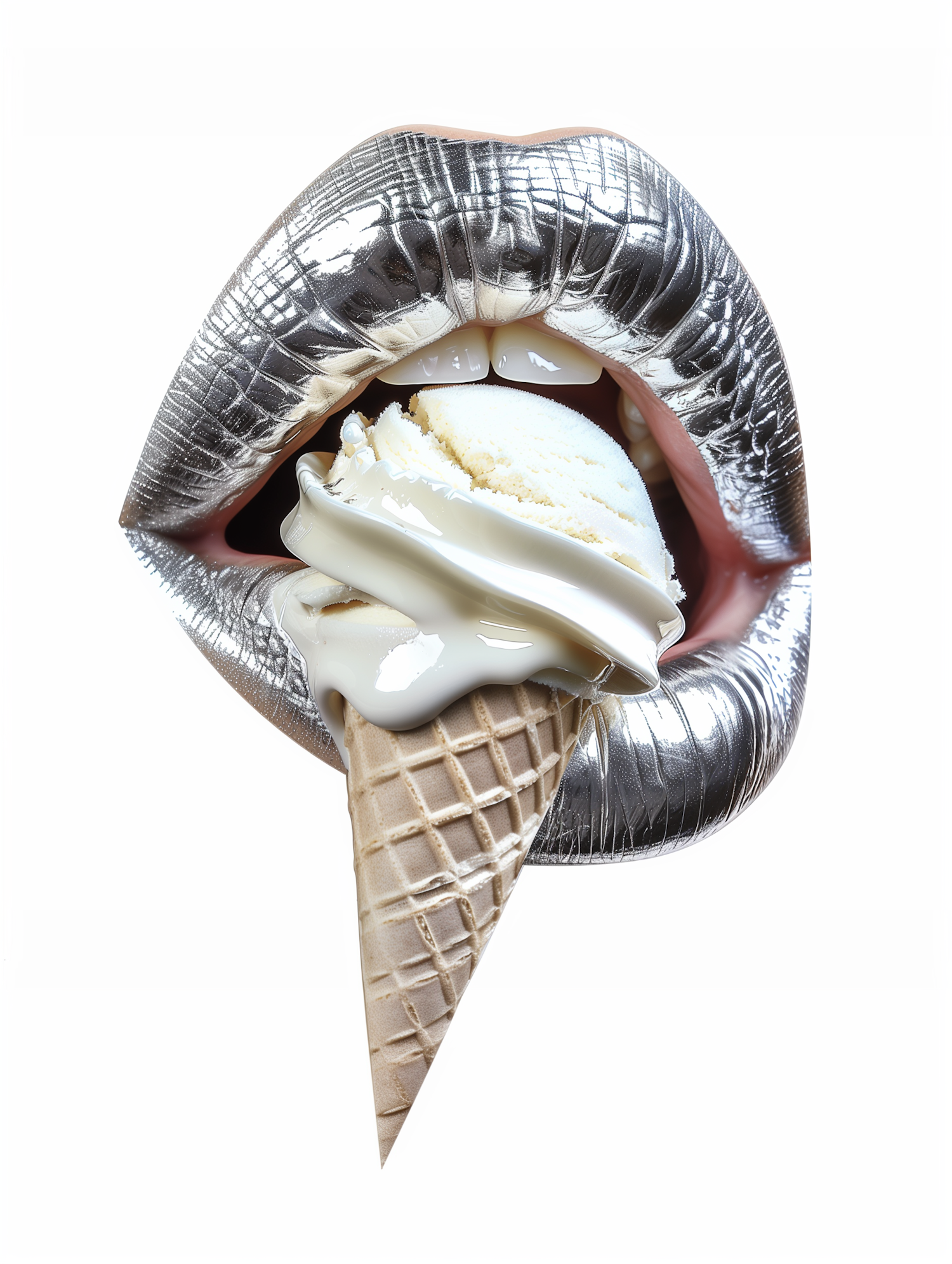 Glossy silver lips biting into a creamy vanilla ice cream cone, set against a clean white background for a bold, modern look.