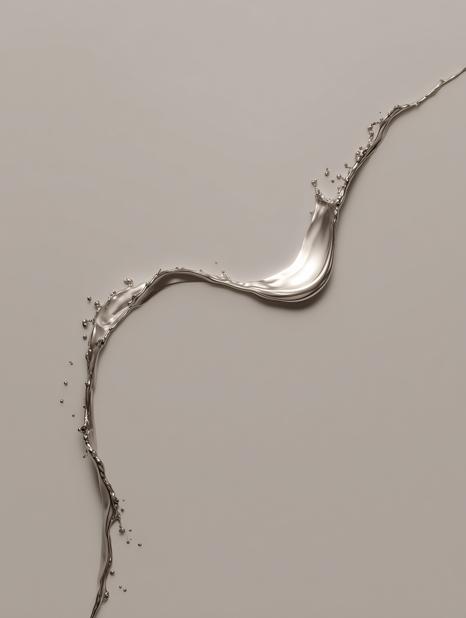 A flowing metallic liquid stream with droplets on a beige background, showcasing dynamic motion and reflective textures.
