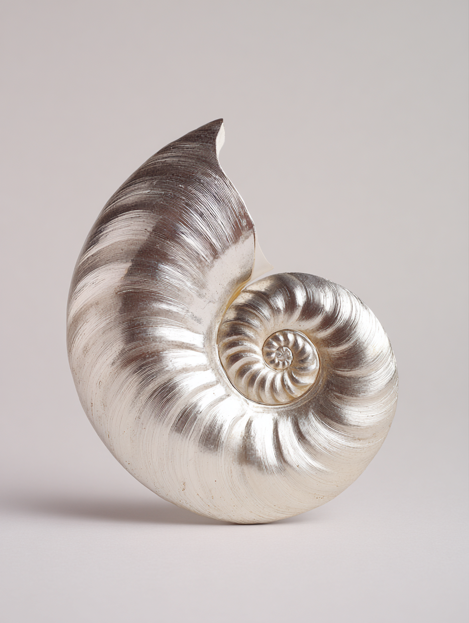 Elegant silver nautilus shell sculpture with intricate spiral design, perfect for modern decor or artistic inspiration.