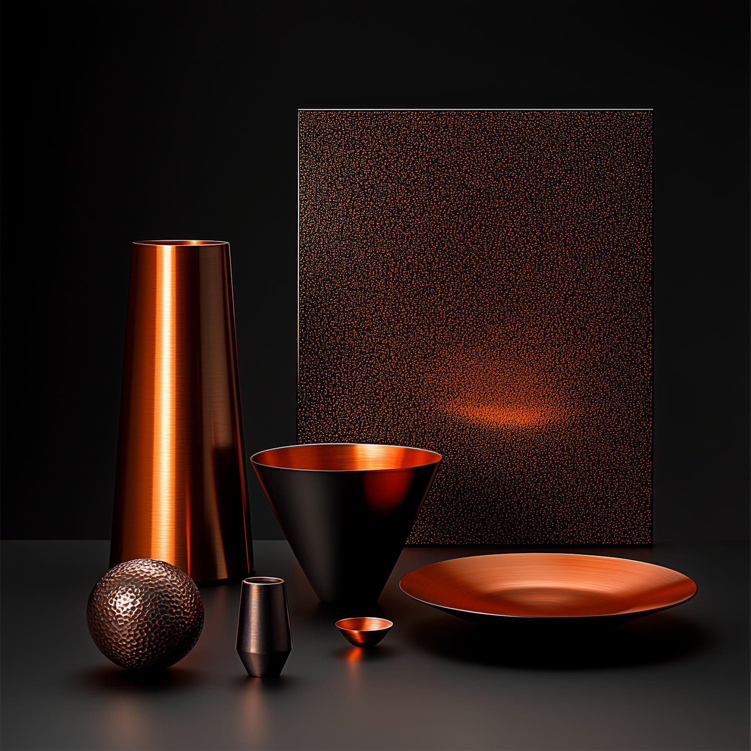 Elegant metallic objects in copper tones against a dark background, featuring vases, bowls, and a textured sphere.