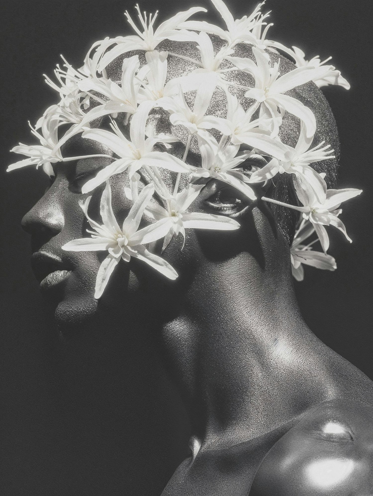 Black and white portrait of a person with dark skin adorned with white flowers, creating a striking contrast and elegant composition.