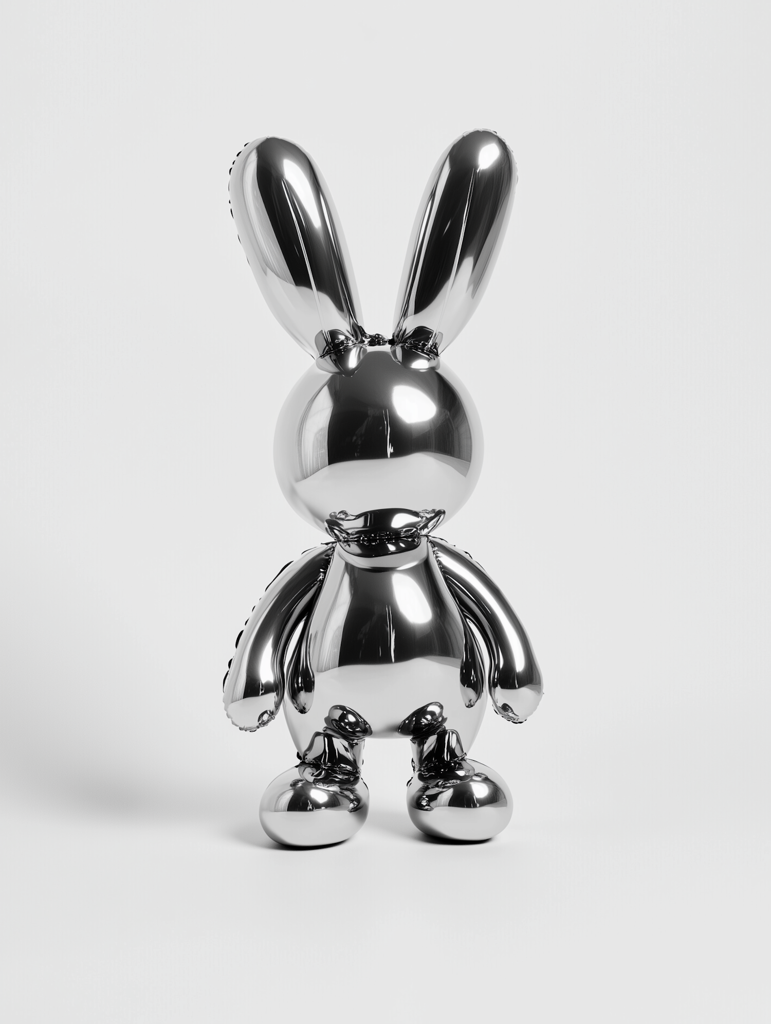 A shiny metallic rabbit sculpture with a balloon-like design and reflective chrome finish, set against a plain white background.
