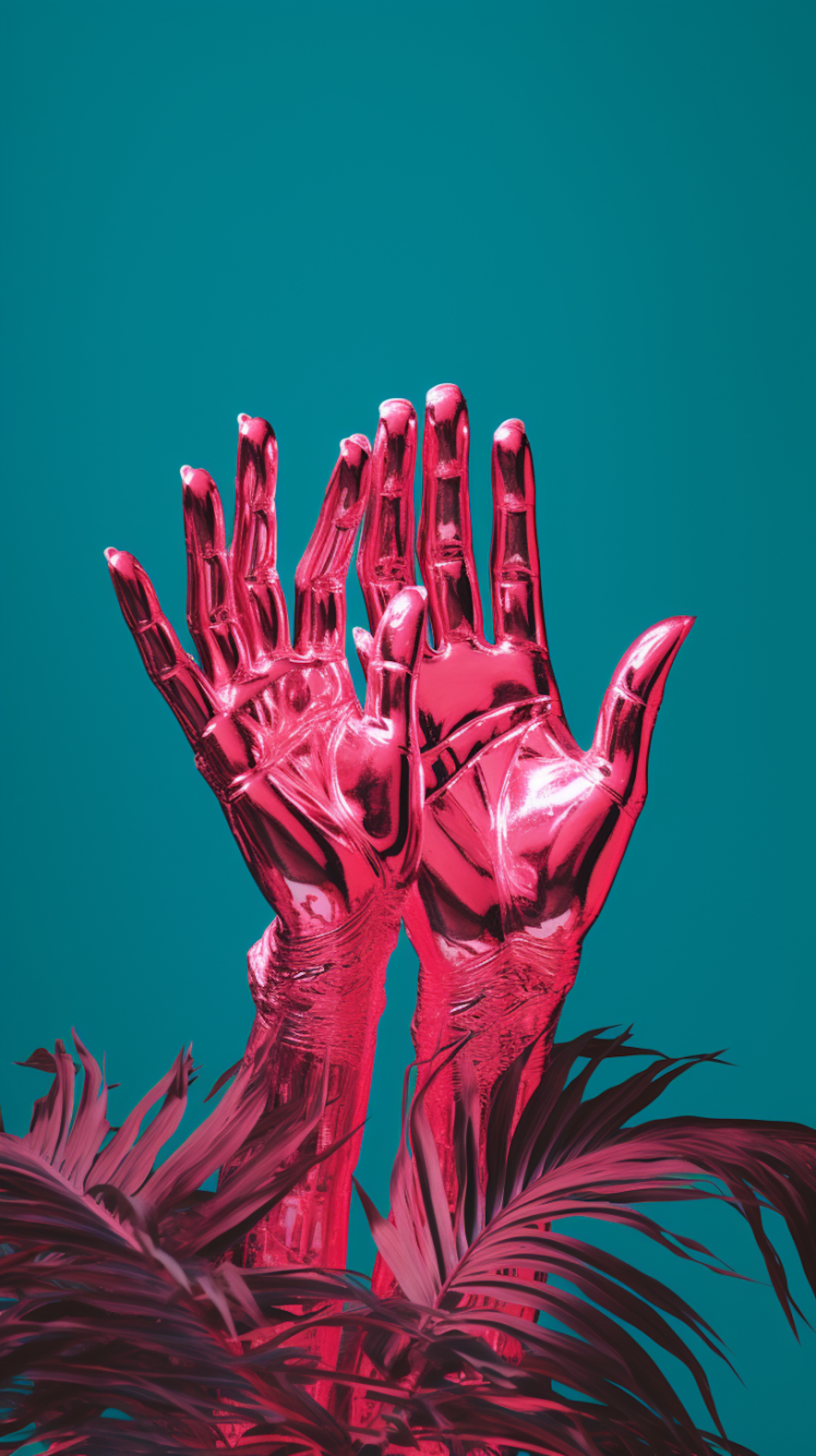 Metallic pink hands raised against a teal background with pink-tinted leaves, creating a bold and modern visual contrast.