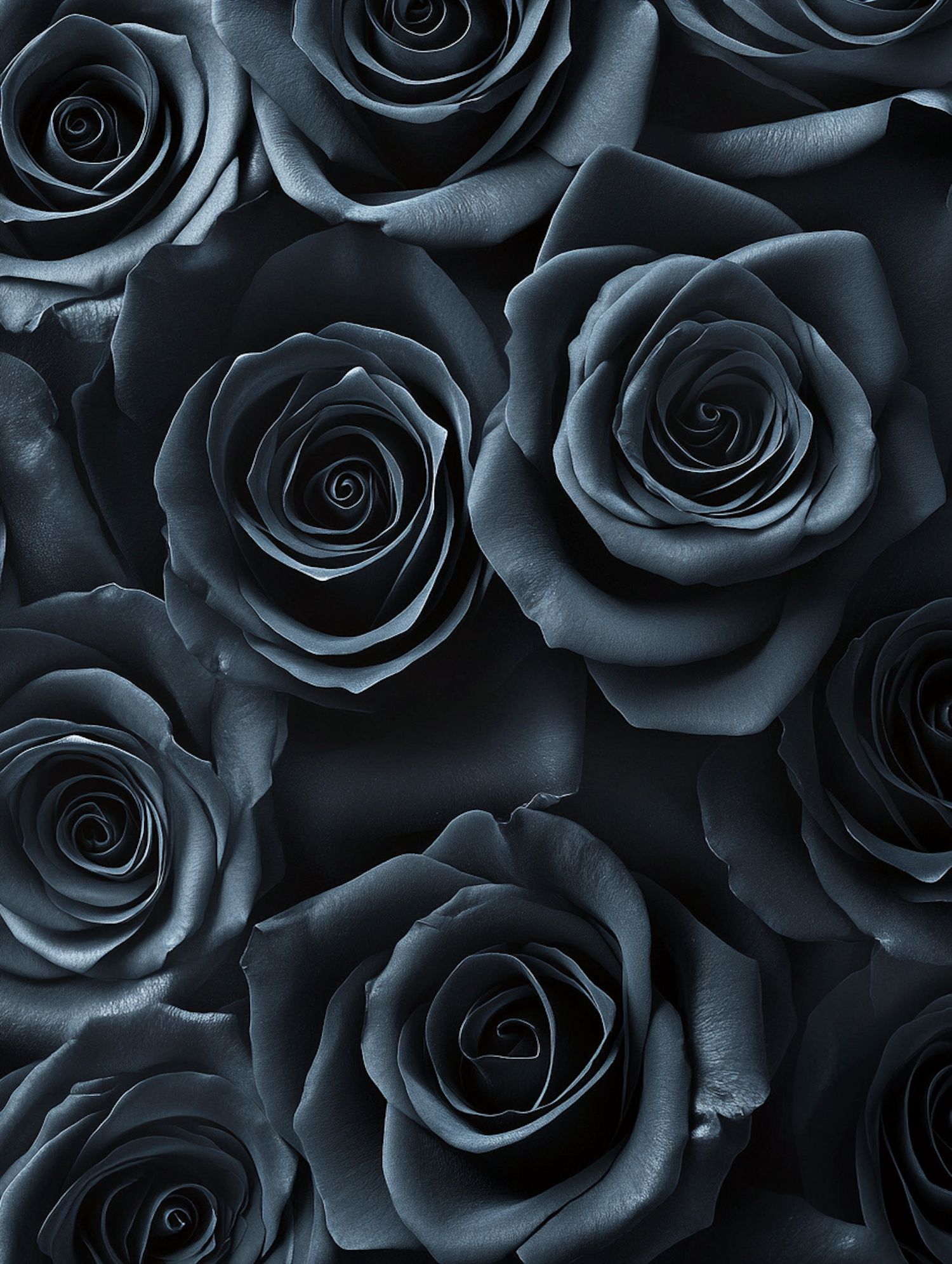 Close-up of dark metallic roses with intricate petal details, creating a dramatic and elegant floral composition.
