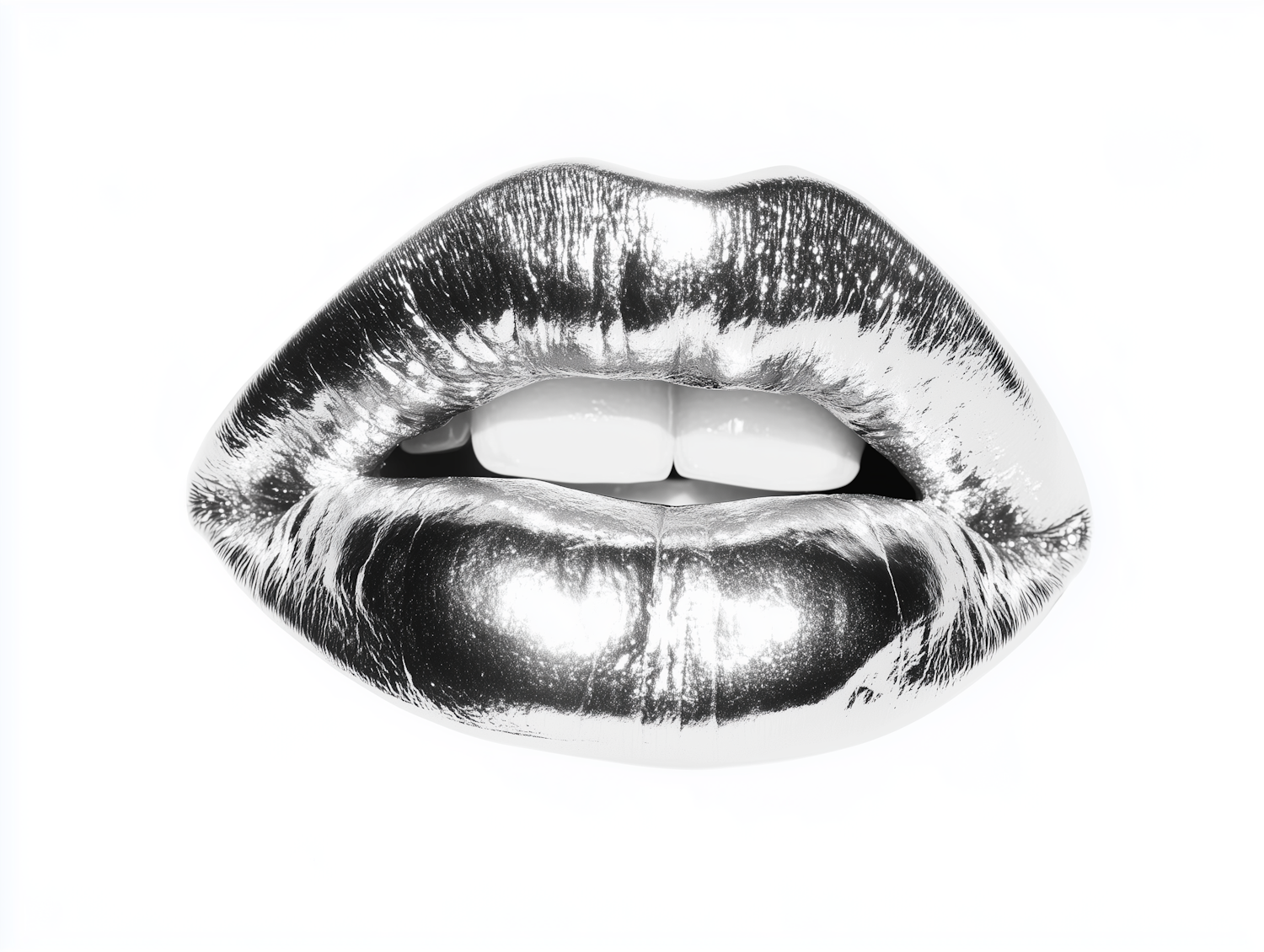 Close-up of metallic silver lips with a glossy finish, slightly parted to reveal white teeth, set against a clean white background.