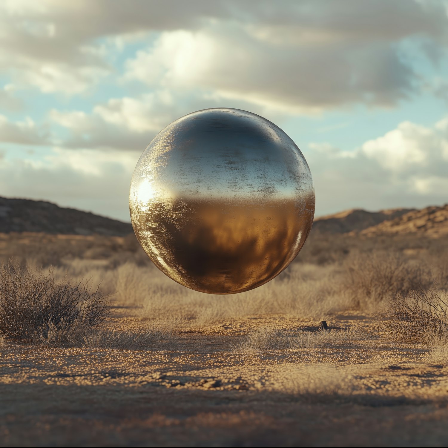 A reflective metallic sphere hovers over a serene desert landscape with golden light and scattered clouds, creating a surreal atmosphere.