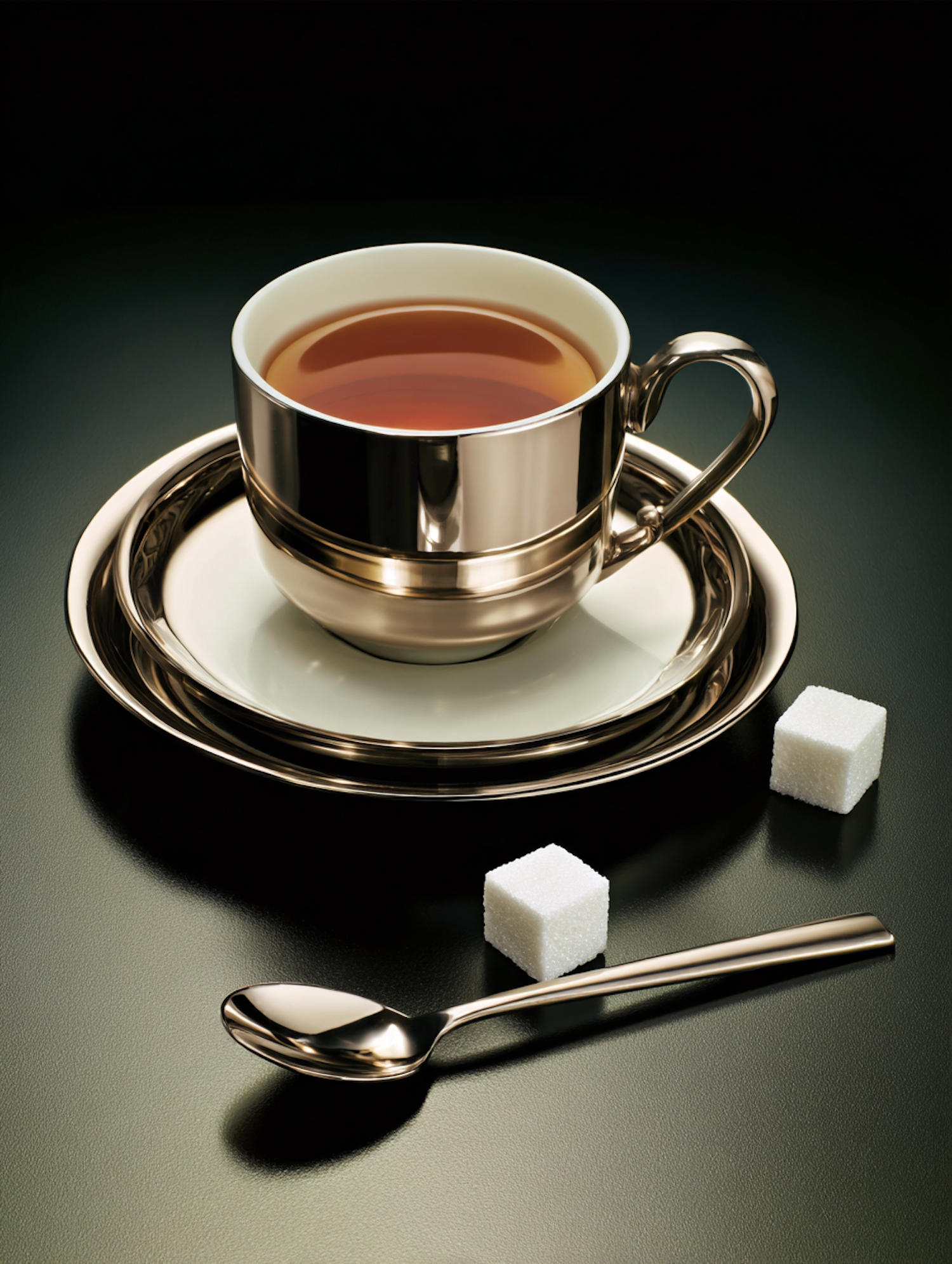 Elegant metallic teacup with tea, sugar cubes, and a matching spoon on a sleek dark surface. Perfect for a refined tea moment.