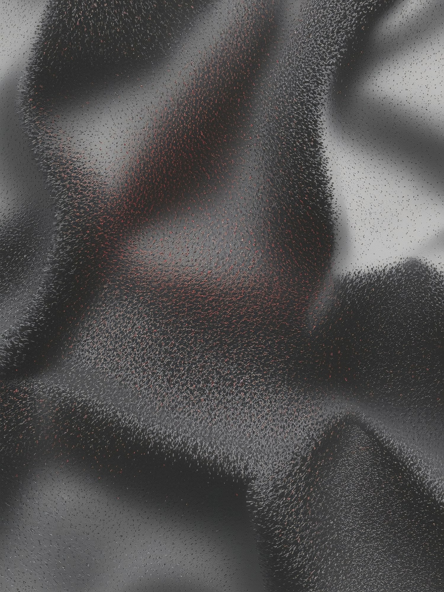 Abstract textured surface with metallic gray tones and red specks, featuring flowing contours and a granular appearance.