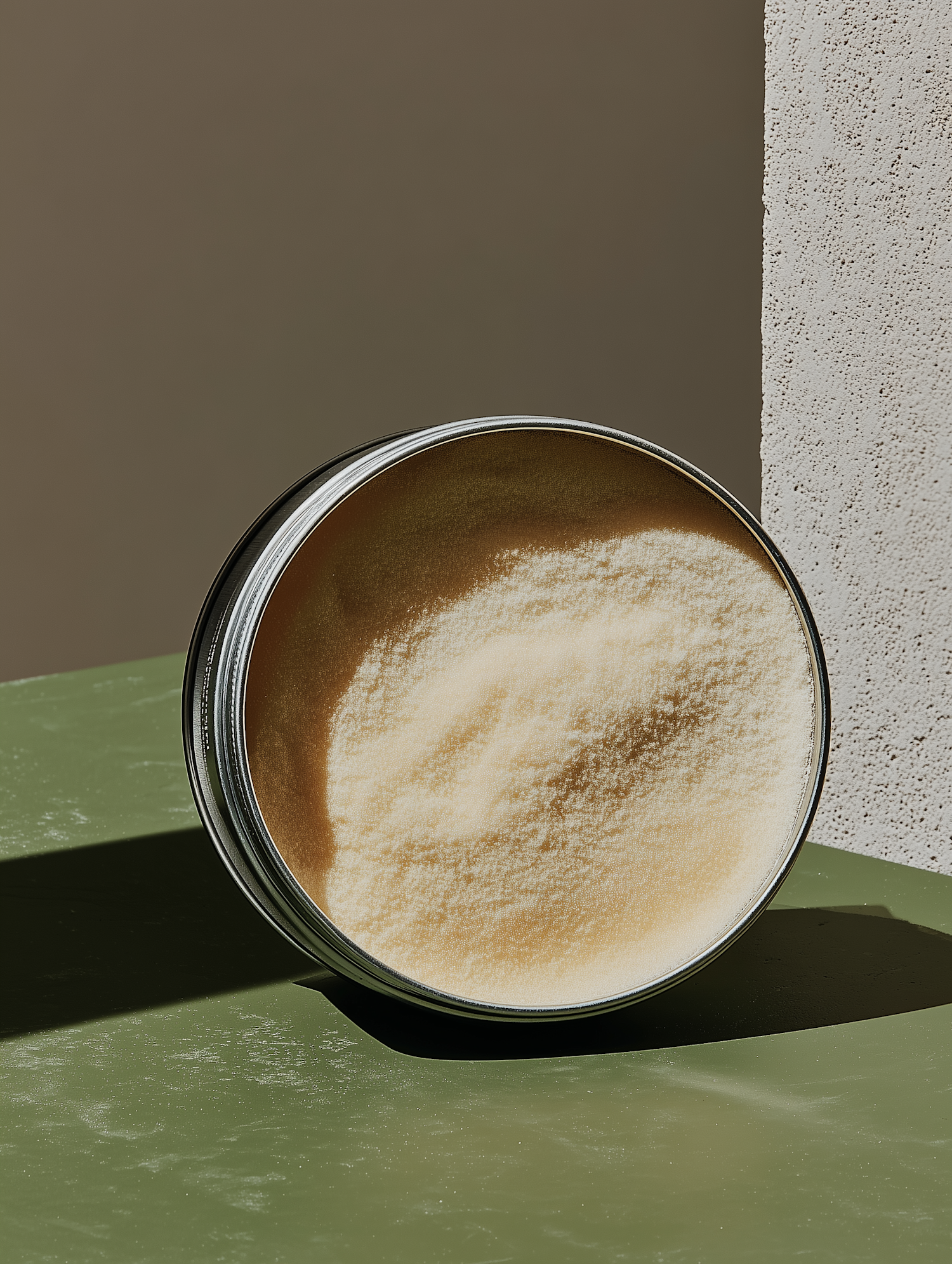 A metallic tin with light powder on a green surface, showcasing a minimalist and clean design with strong lighting contrasts.