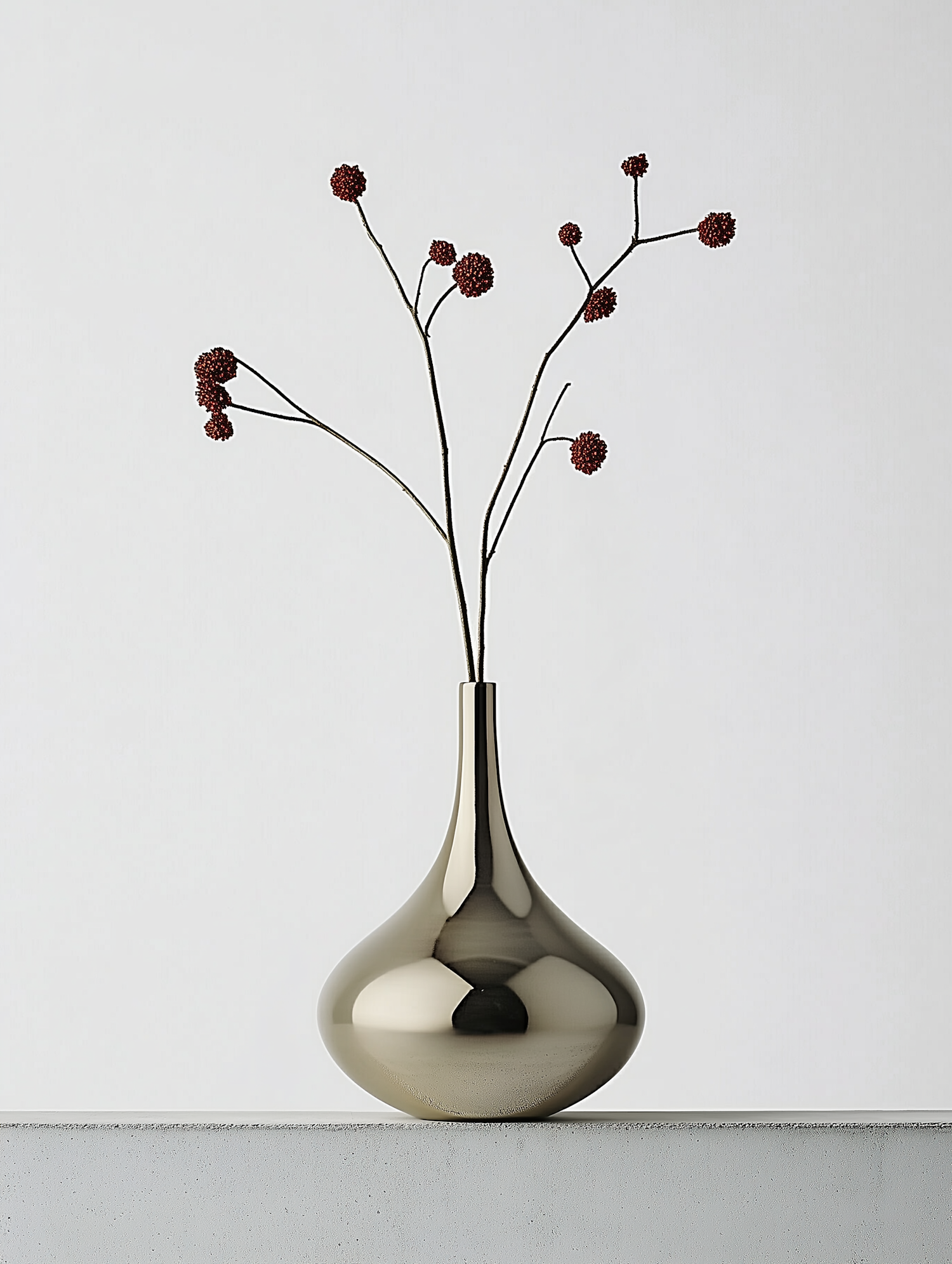 Minimalist metallic vase with red berry branches on a light gray background, showcasing modern elegance and simplicity.
