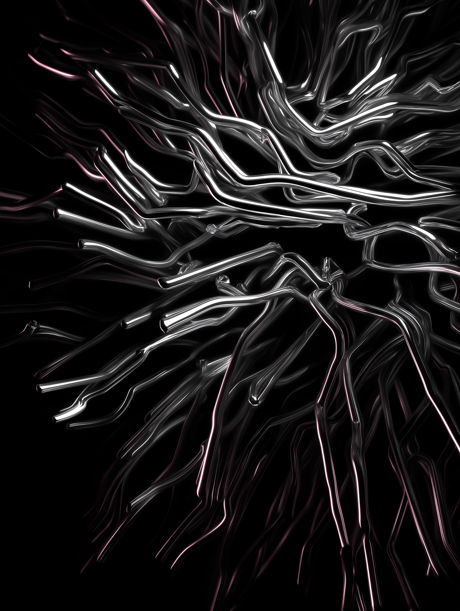 Shiny, flowing silver rods intertwine against a black background, creating an abstract, energetic visual effect.