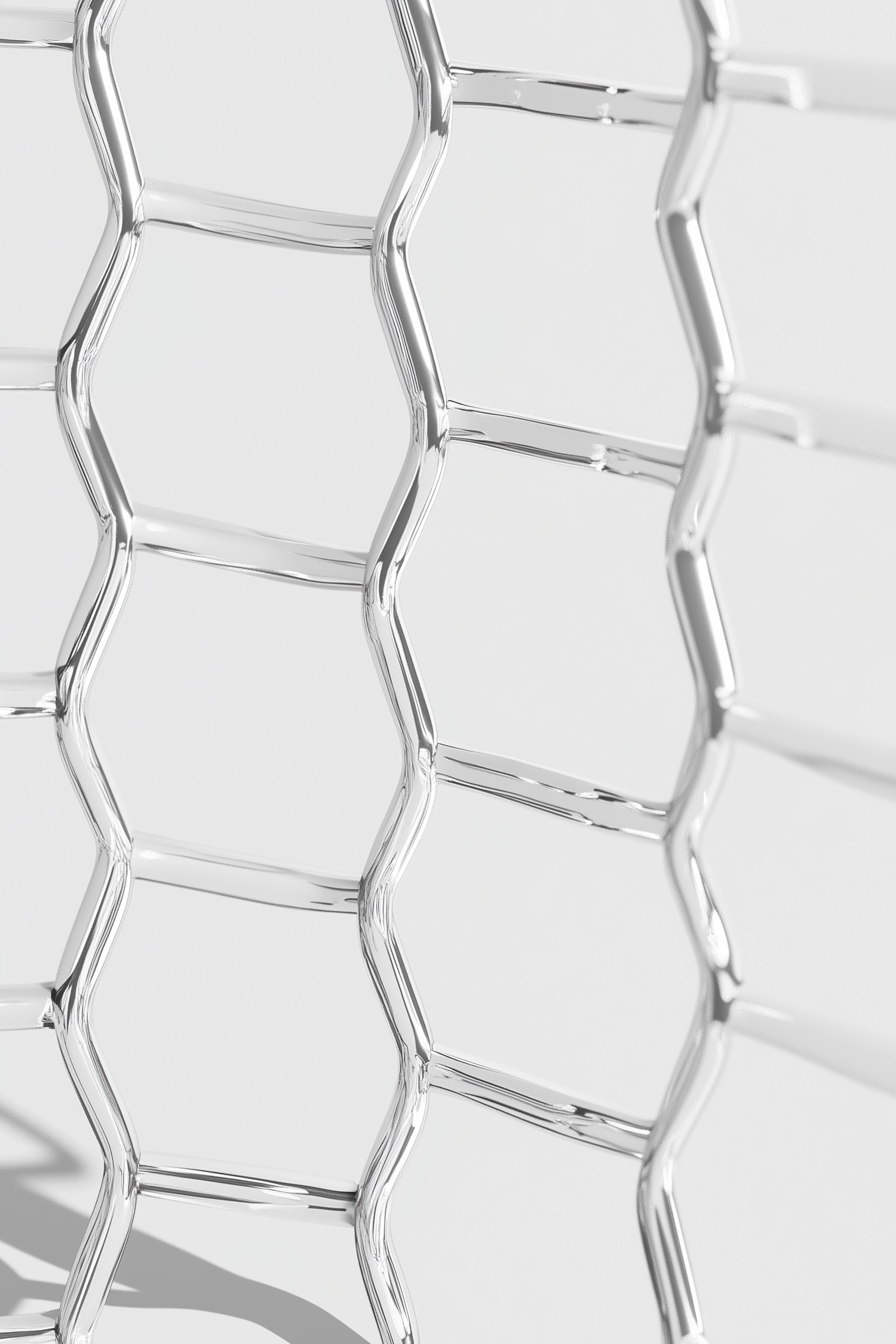 Close-up of a shiny metallic wire mesh with a hexagonal pattern, set against a light gray background. Sleek and modern design.