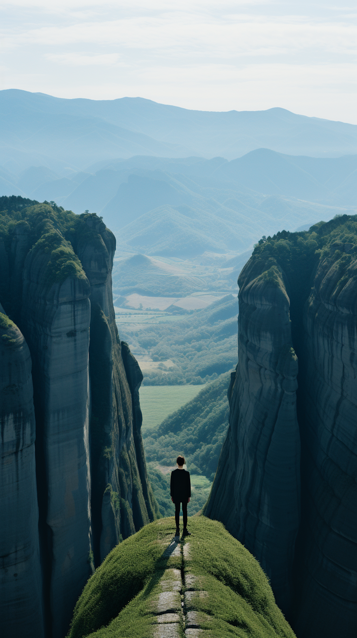 A person stands on a grassy ridge, overlooking majestic rock formations and distant mountains under a serene blue sky.