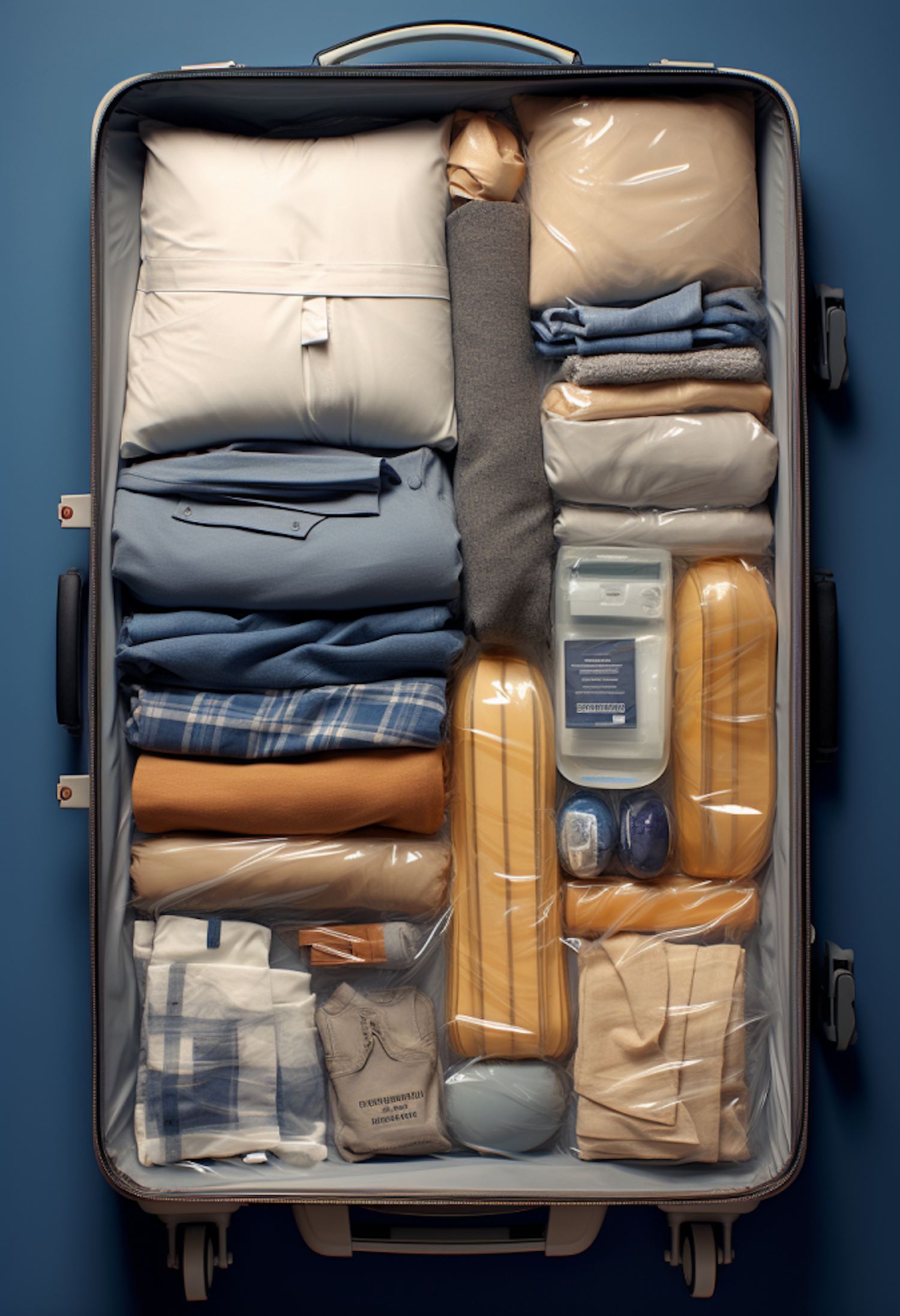 Neatly packed suitcase with clothes in blue and beige, vacuum-sealed items, and toiletries against a blue background.