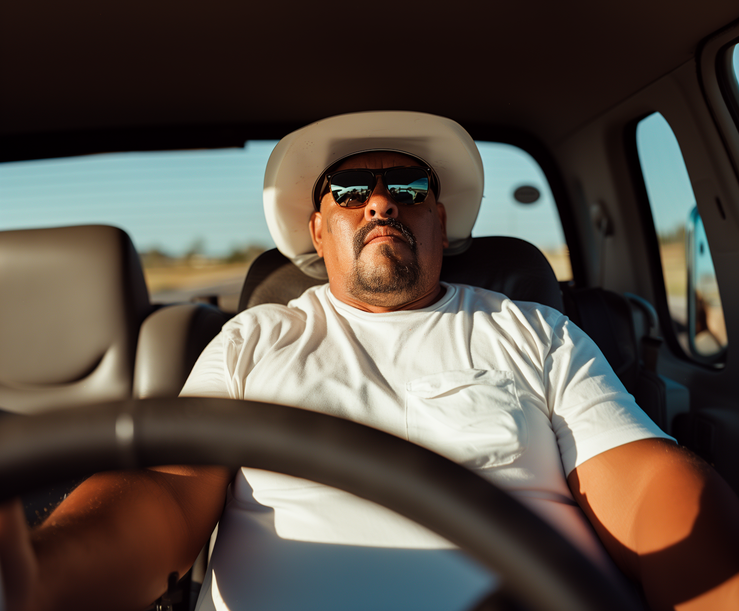 Man in a white cowboy hat and sunglasses sits in a car, bathed in warm sunlight, exuding a relaxed vibe.