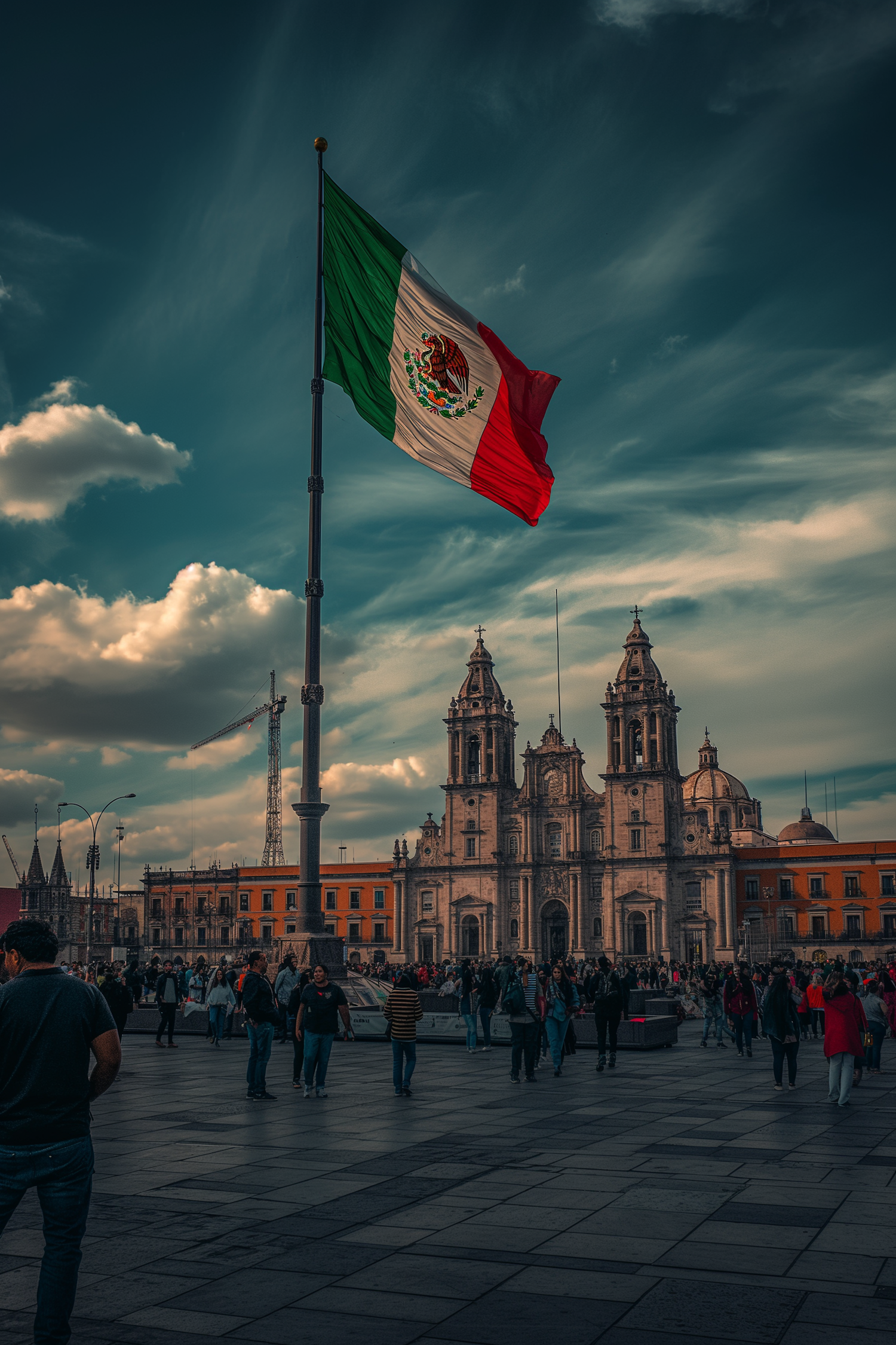 Vibrant Mexican flag waves over a bustling plaza with a historic cathedral, under a dramatic sky filled with clouds.