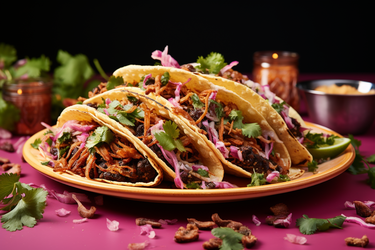 Delicious tacos with shredded meat, cilantro, and pickled onions on a vibrant plate, set against a bold magenta background.