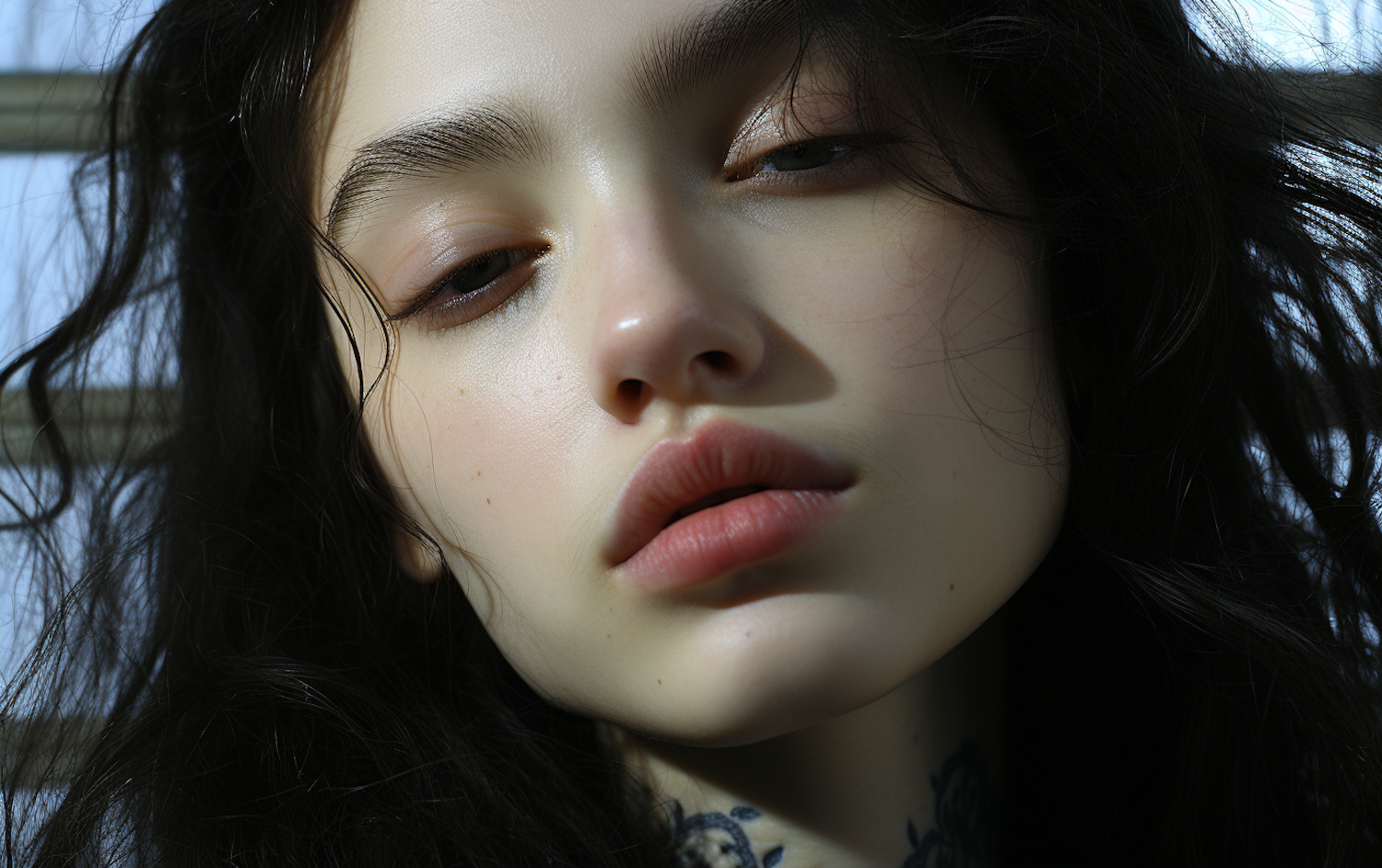 Close-up portrait of a young woman with fair skin, black hair, and a serene expression, highlighting her natural beauty and subtle neck tattoo.