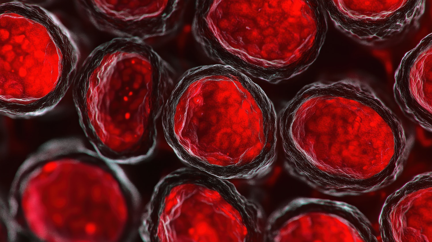 Microscopic view of vibrant red blood cells with detailed textures and translucent membranes, set against a dark contrasting background.