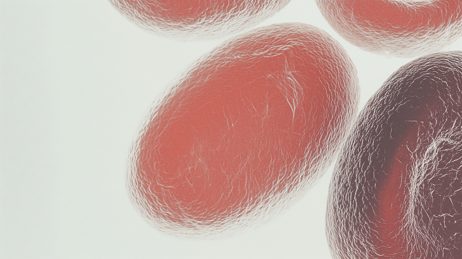 Microscopic view of red blood cells with detailed textures and vibrant red hues against a pale background.