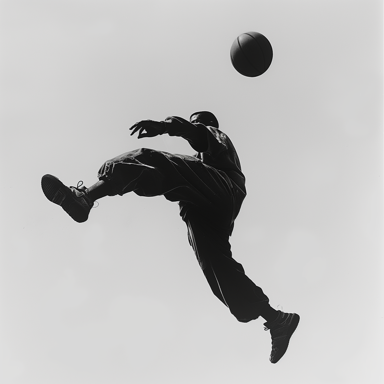 Dynamic black and white photo of a person jumping with a basketball, captured from a low angle against a clear sky.