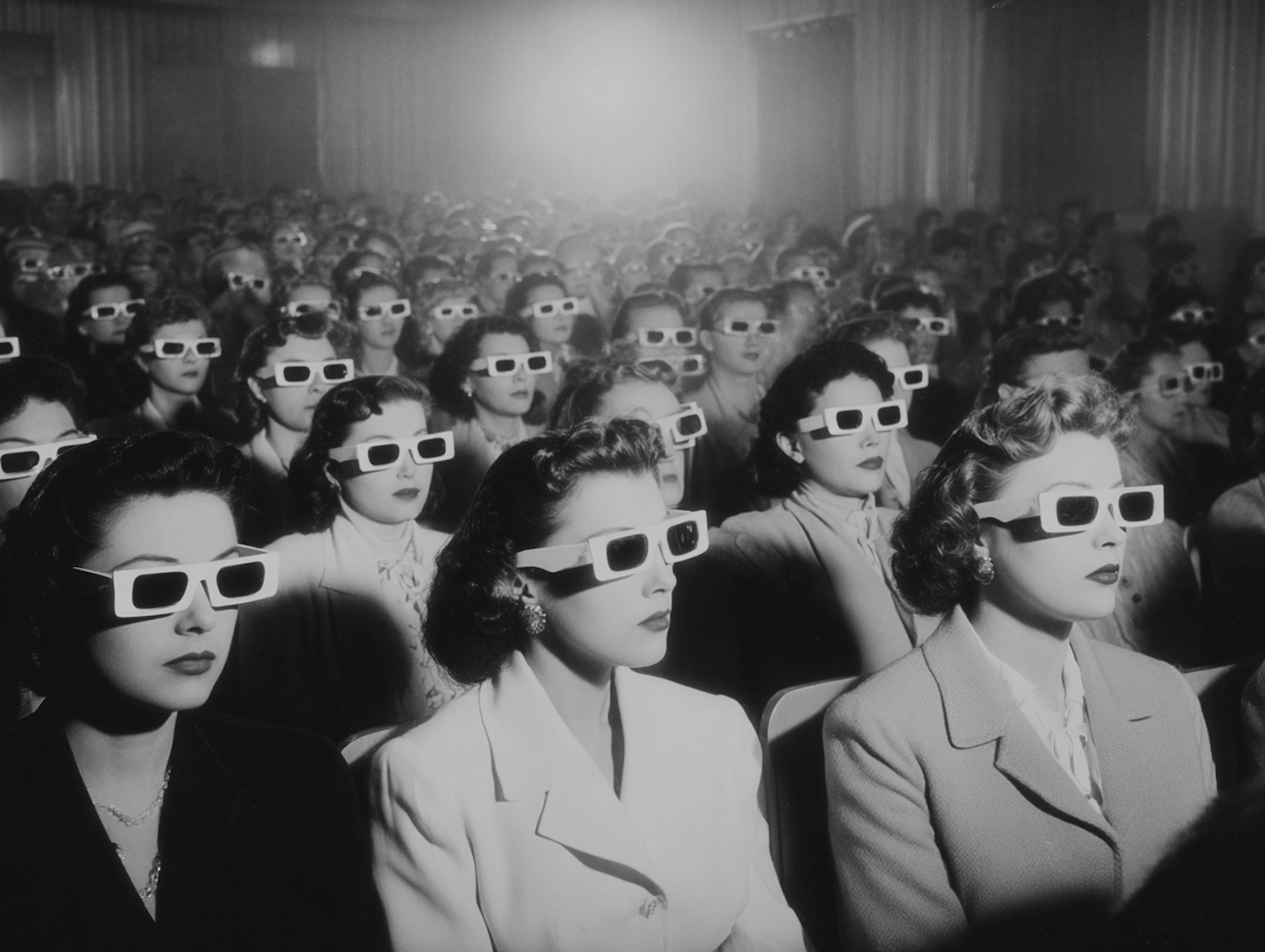 A historical photograph of an audience wearing classic 3D glasses, engaged in a captivating cinematic moment.