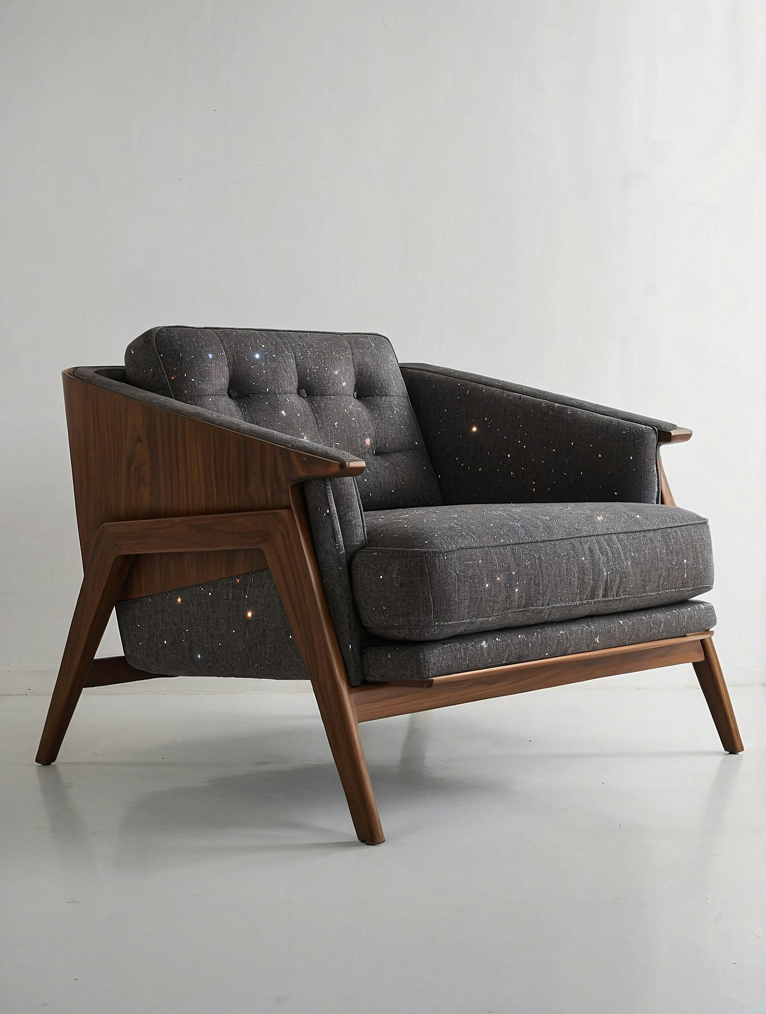Mid-century modern armchair with a wooden frame and starry-patterned gray upholstery, perfect for adding a retro yet chic vibe to any space.