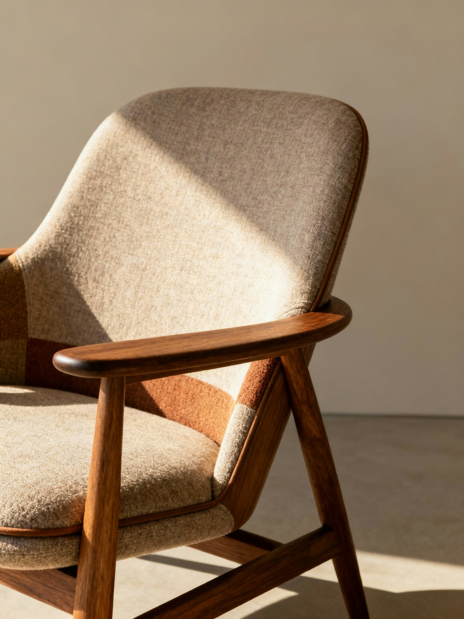 A stylish mid-century modern armchair with wooden frame and neutral fabric upholstery, bathed in soft sunlight for a cozy aesthetic.