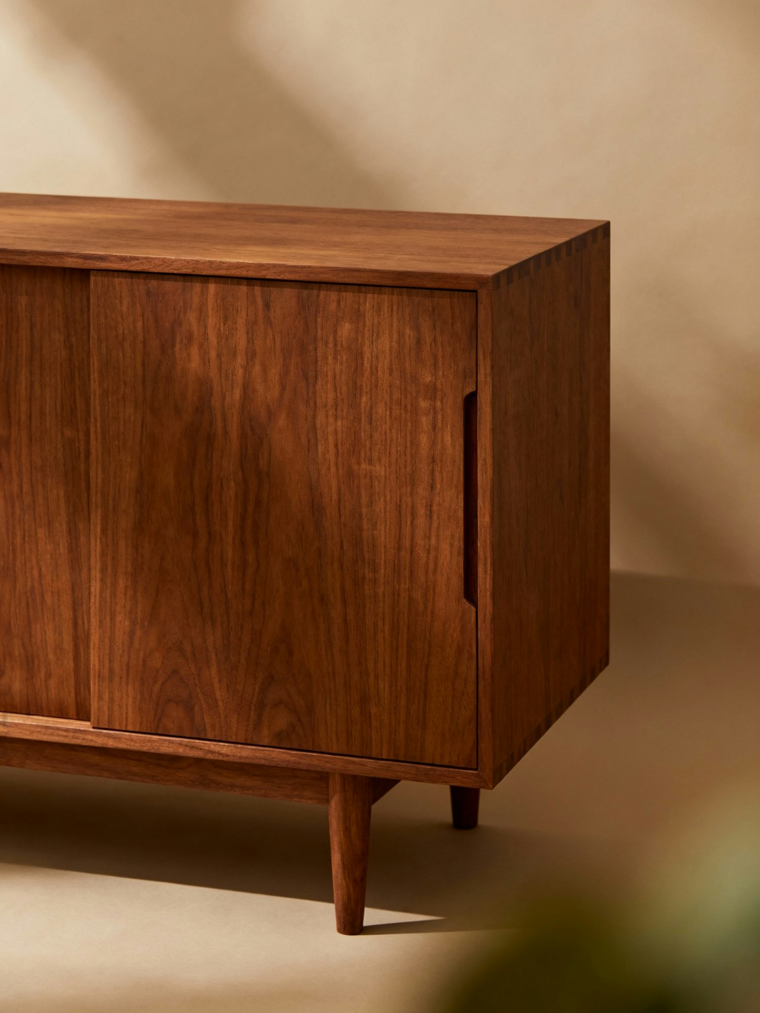 A close-up of a mid-century modern wooden cabinet with a warm wood finish and minimalist design, set against a neutral background.