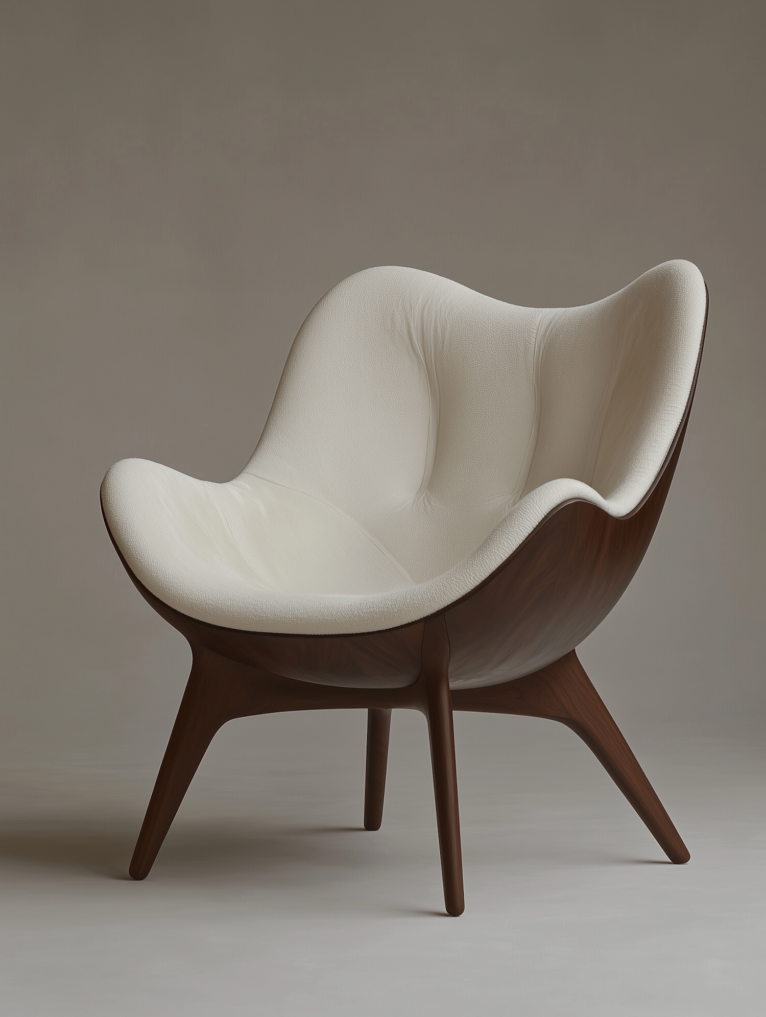 Elegant mid-century modern lounge chair with curved wooden frame and tufted white upholstery, perfect for stylish interiors.