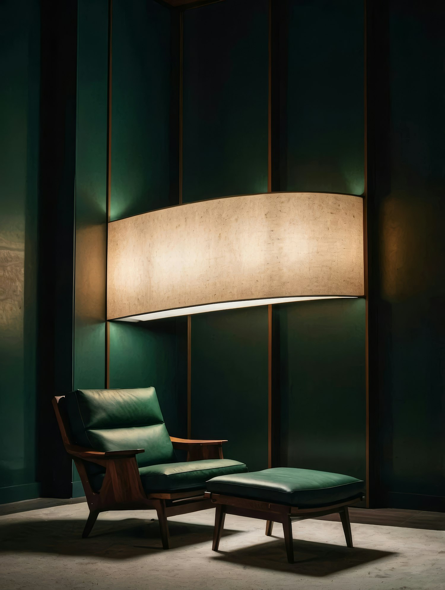 Luxurious green leather armchair and ottoman in a mid-century modern design, set against a warm-lit, deep green interior.