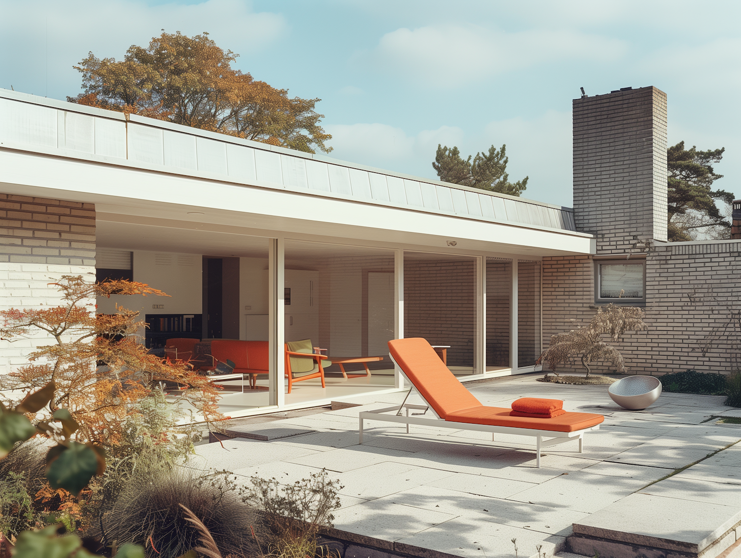 Modern patio with orange lounge chair, white brick walls, and glass doors. Minimalist design with plants and a metallic fire pit.