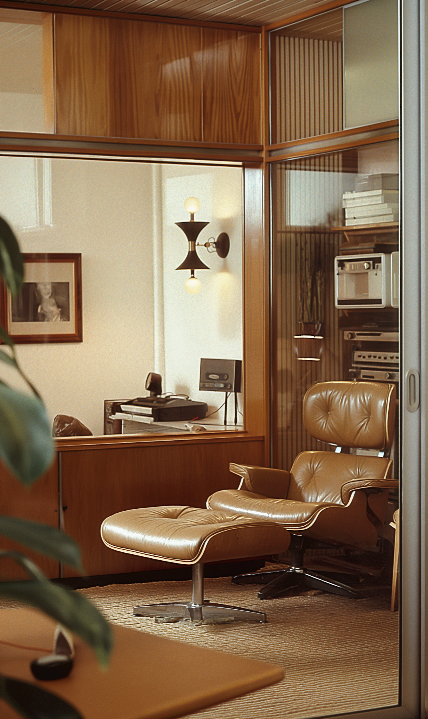 Mid-century modern office with Eames chair, wood paneling, and vintage audio equipment. Warm tones and sleek design create a cozy atmosphere.
