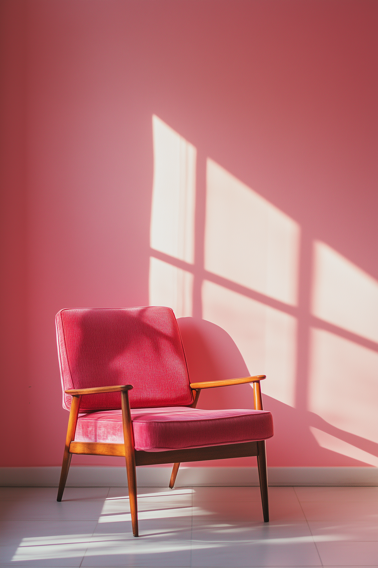 Mid-century modern pink armchair against a pink wall with sunlight casting geometric shadows, creating a warm and retro aesthetic.