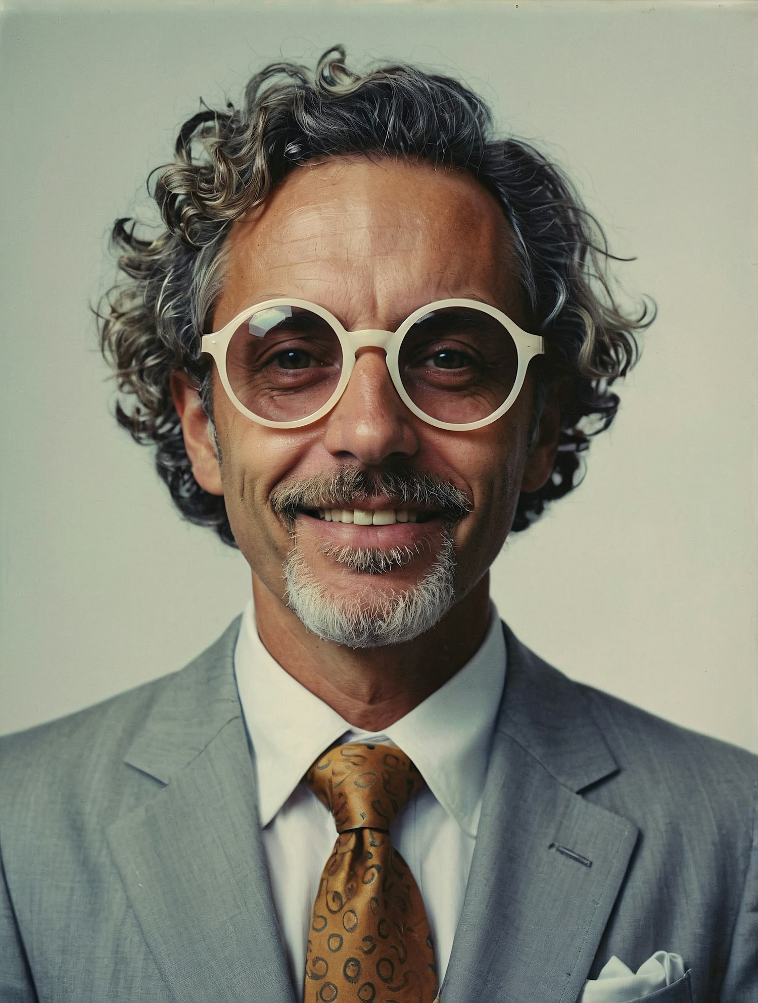 Smiling man with curly hair, round white glasses, and a gray suit paired with a golden-brown tie. Stylish and charismatic portrait.