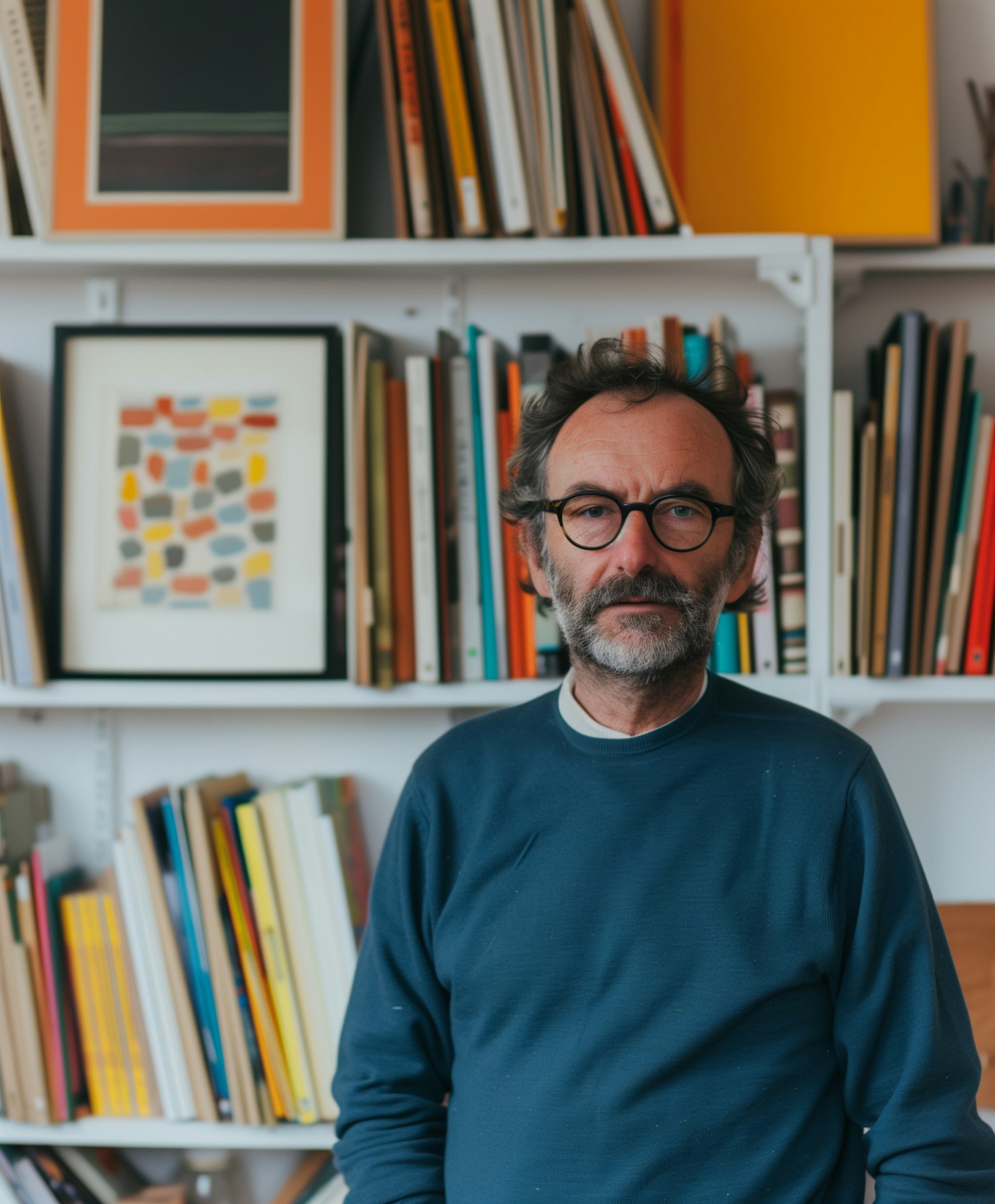 Middle-aged man with glasses and beard in front of a colorful bookshelf and framed art, wearing a blue sweater.