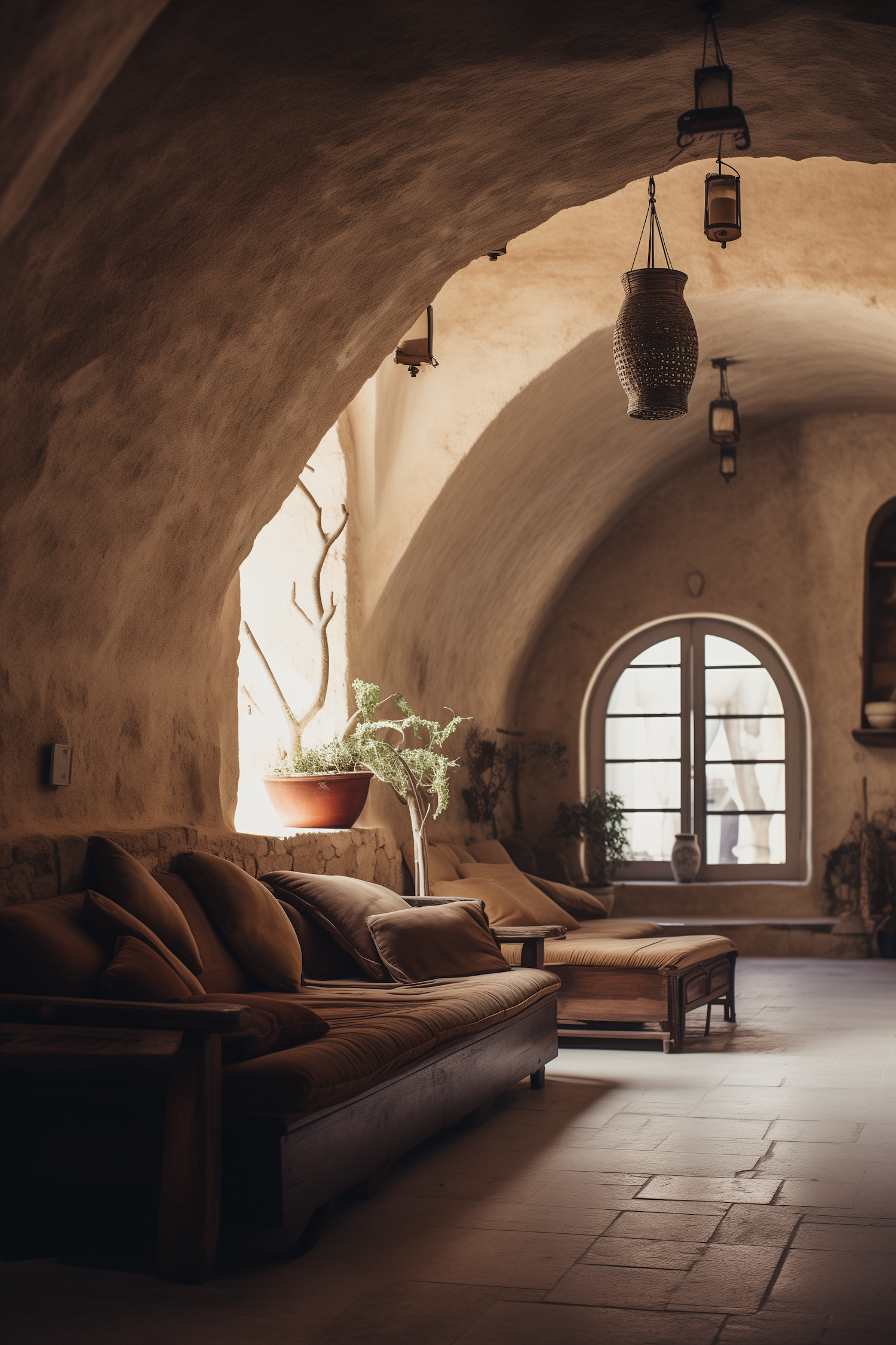 Rustic interior with arched ceiling, cozy sofa, and ambient lighting. Earthy tones and natural light create a serene atmosphere.