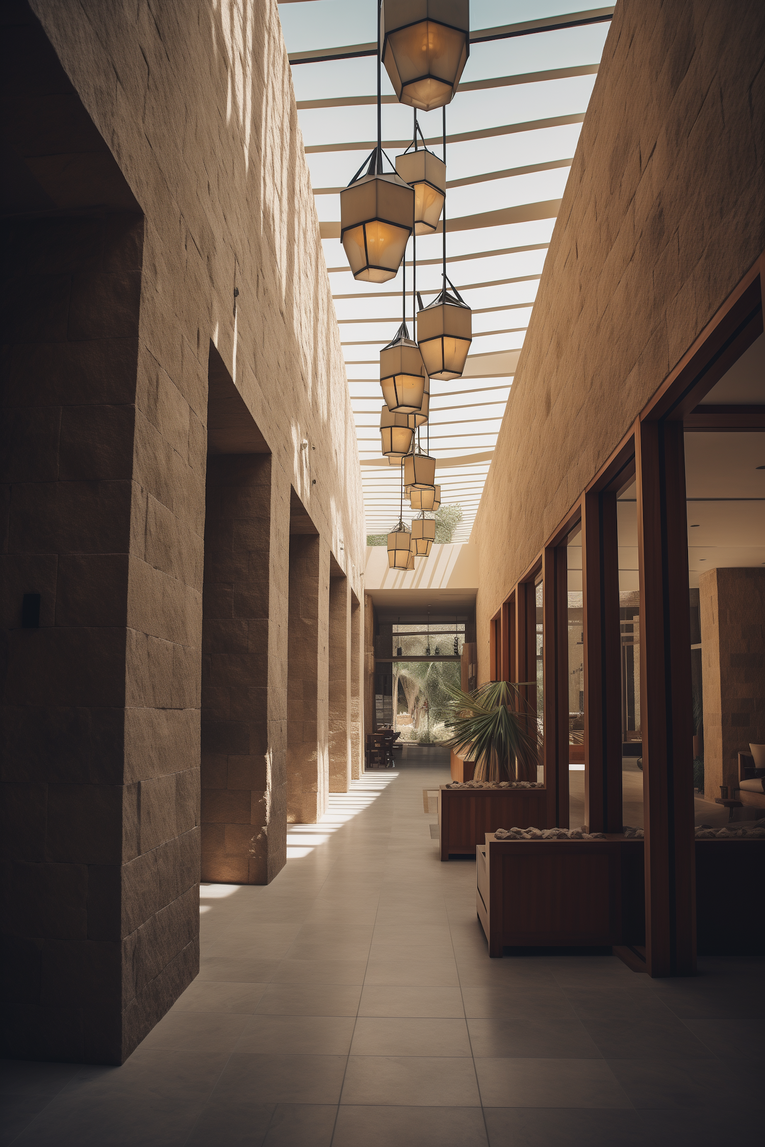 Elegant hallway with stone walls, pendant lights, and sunlight streaming through a slatted roof. Modern design with natural elements.