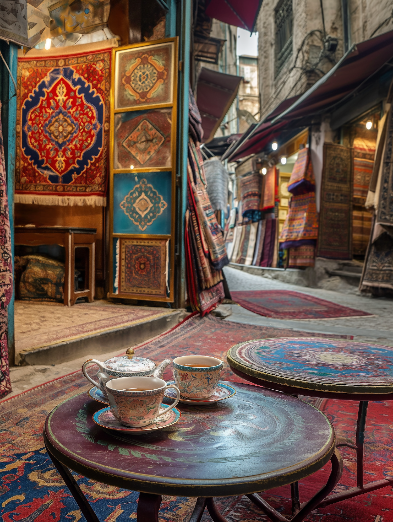Colorful Middle Eastern bazaar with vibrant carpets and traditional tea set on tables, creating a warm, inviting market scene.