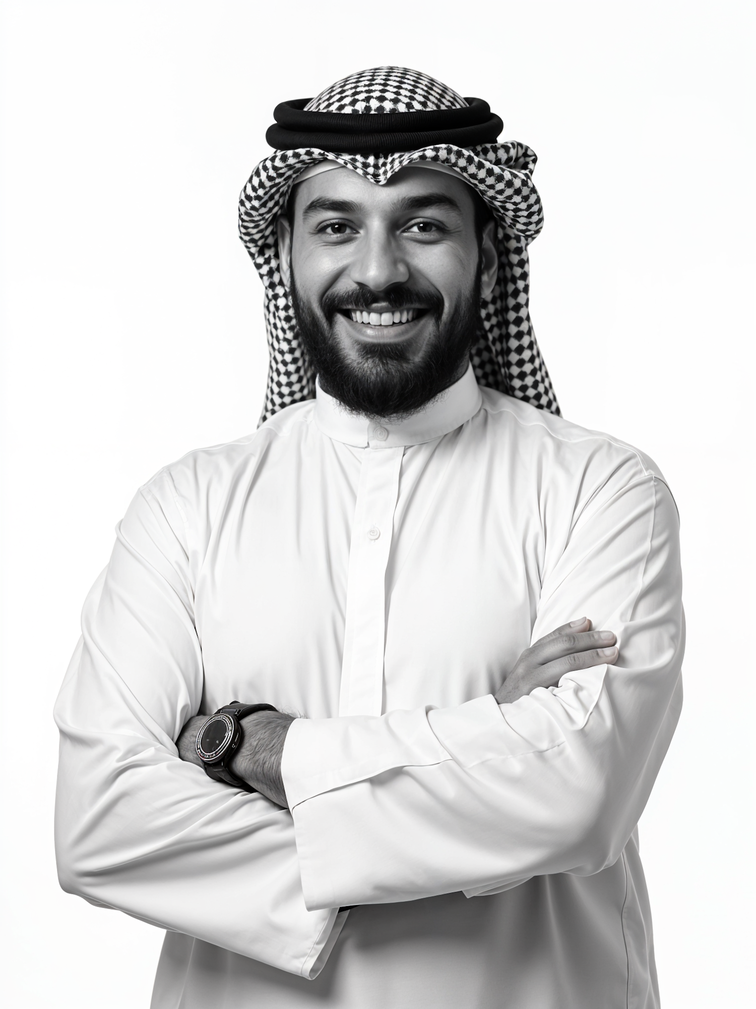 Smiling man in traditional Middle Eastern attire with a modern wristwatch, exuding confidence and warmth in a black-and-white portrait.