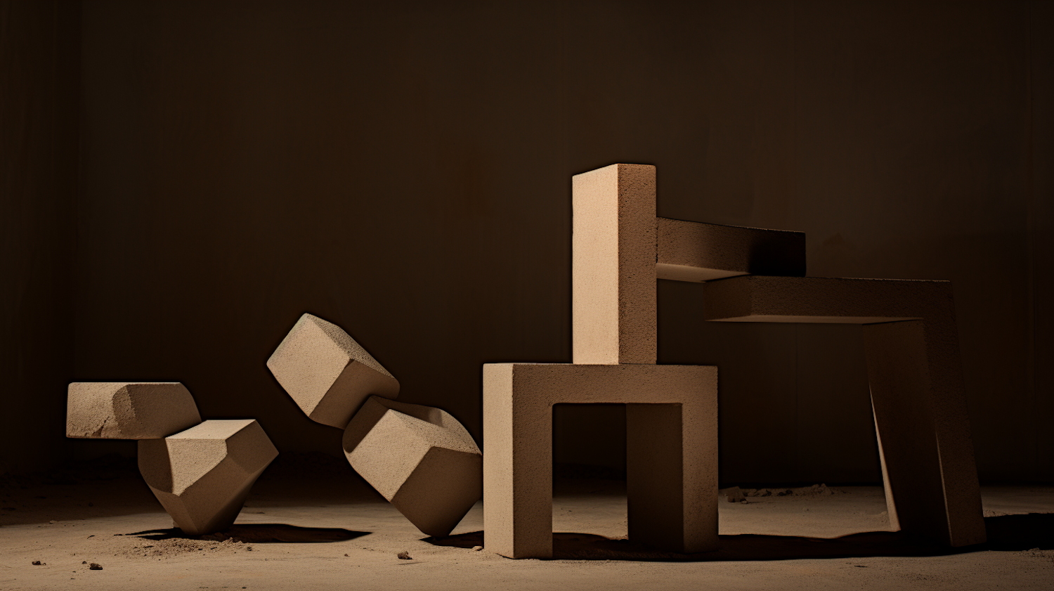 Geometric shapes in sandy textures arranged in a dimly lit space, creating a dramatic play of light and shadow.
