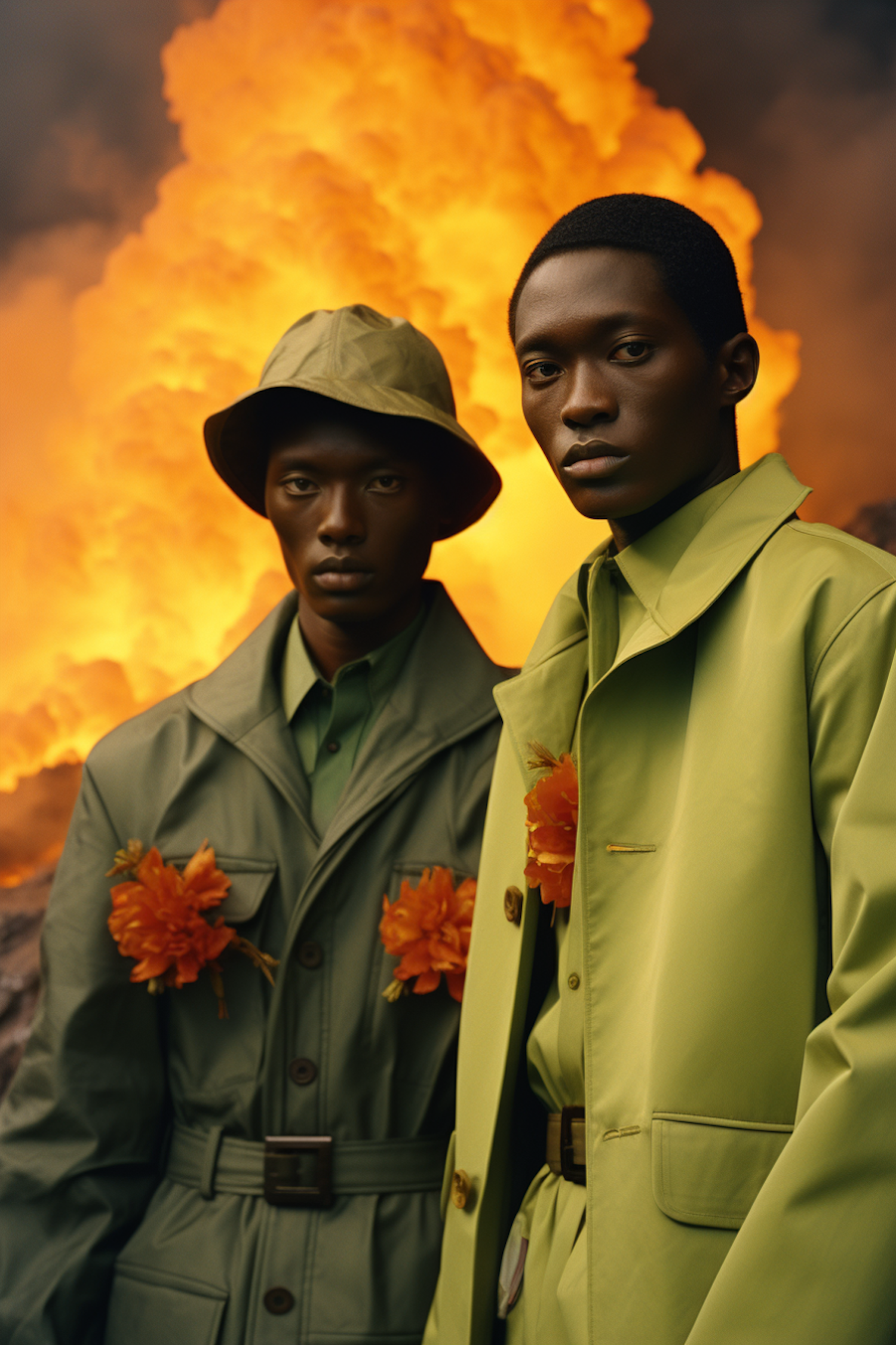 Two men in green coats with orange flowers stand before a fiery backdrop, creating a striking contrast of colors and emotions.