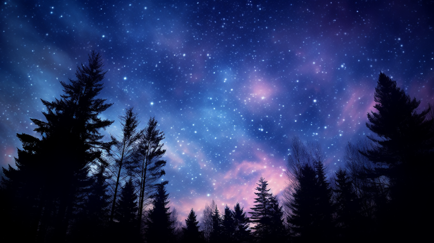 Starry night sky with silhouetted pine trees, featuring vibrant blues and purples. A tranquil and mesmerizing celestial scene.