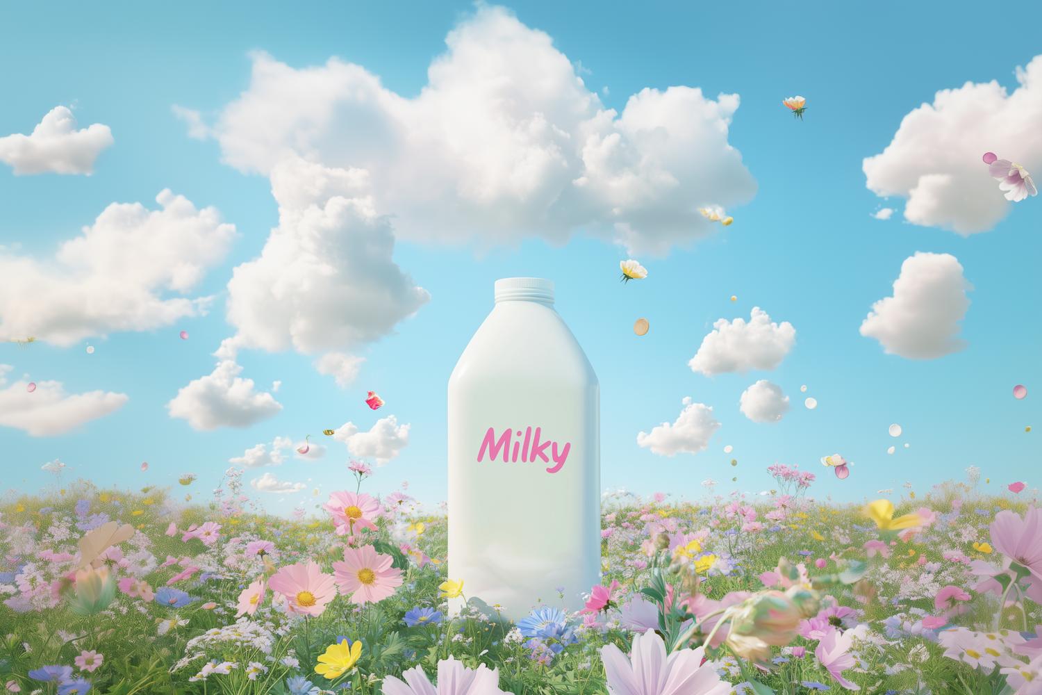 Whimsical milk carton in a colorful flower field under a bright blue sky with fluffy clouds.