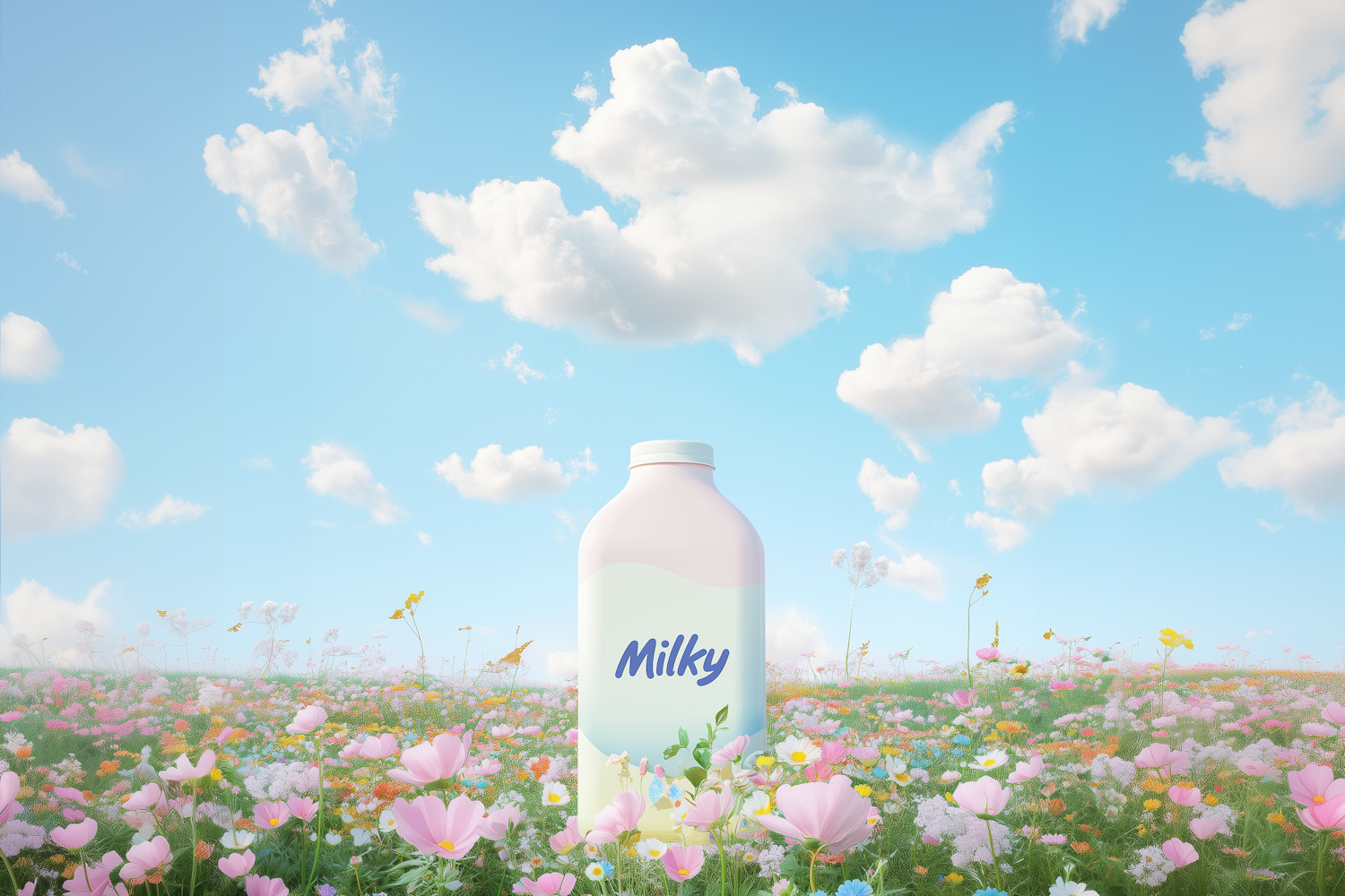 A large milk bottle labeled 'Milky' in a vibrant flower field under a bright blue sky with fluffy clouds.